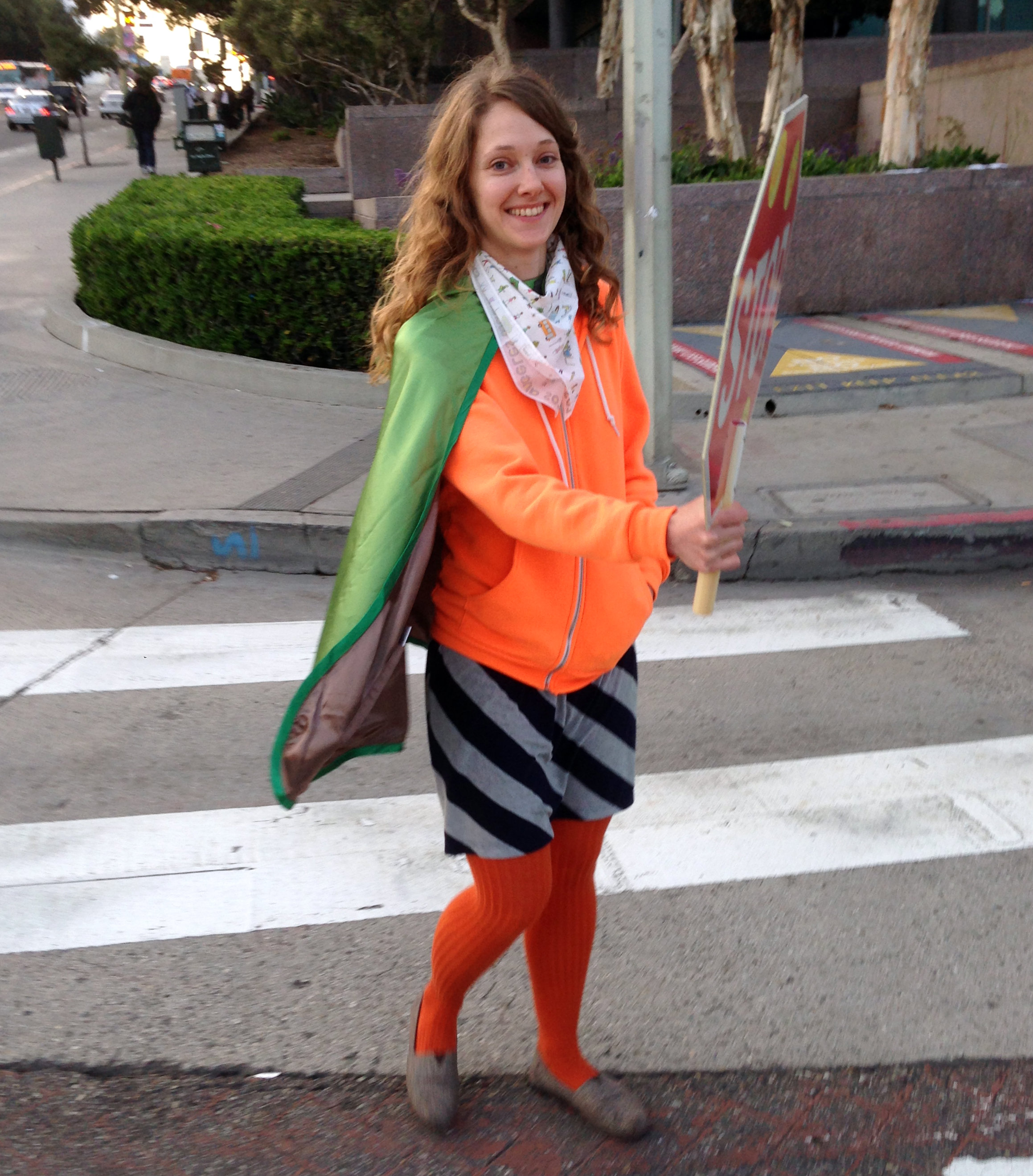 L.A. Walks has reviewed car-ped crash data and identified several areas around Metro stations where there are large numbers of both pedestrians and collisions that harm them. Last October, the organization staged superhero interventions in Hollywood and MacArthur Park areas; yesterday’s walk signal in the sky drew the heroes downtown. In downtown L.A., Recent LAPD stings of scofflaw driver behavior… never happened. Volunteers gathered at street corners outside of Union Station and later the Red/Purple Line Civic Center Station.