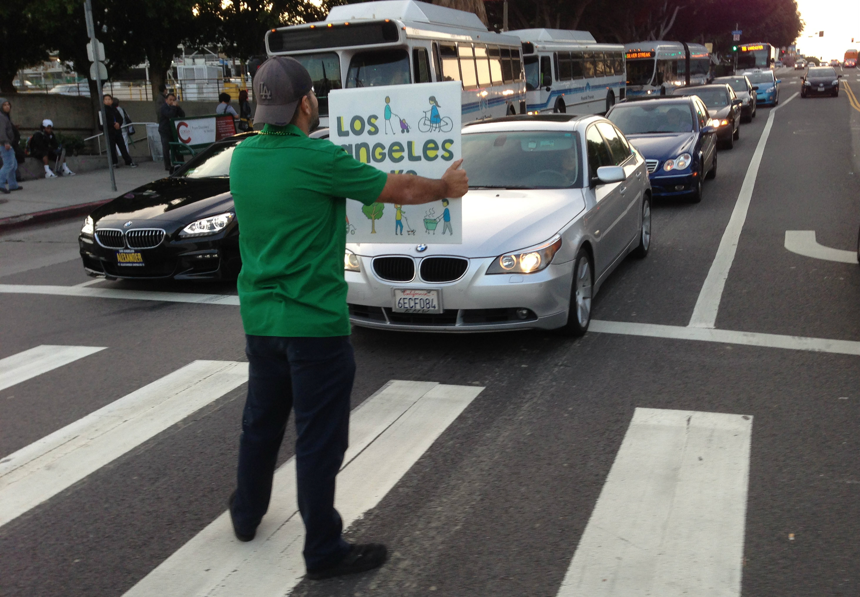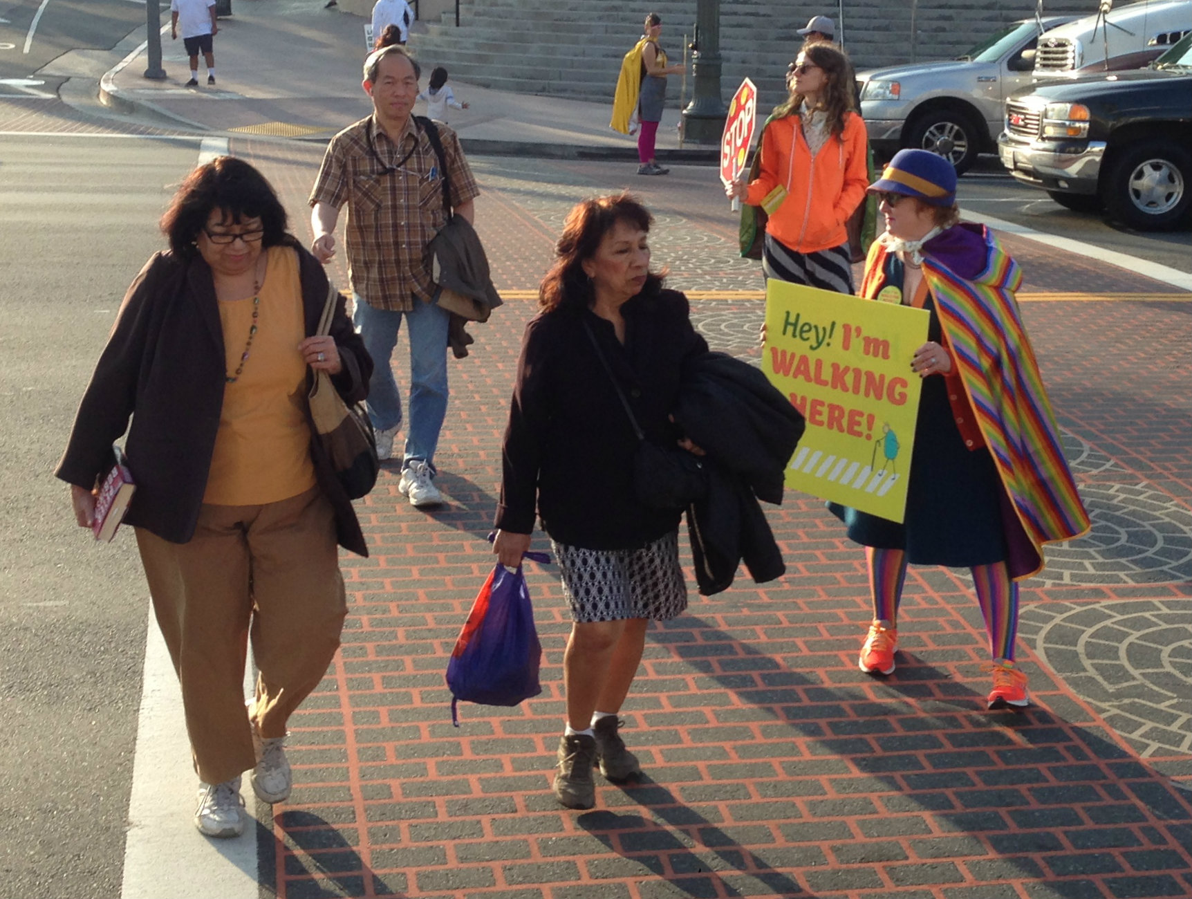 L.A. Walks Steering Committee member Alexis Lantz emphasized that L.A. Walks volunteers weren’t out to stop traffic, but just to keep pedestrians safe from cars making illegal right and left turns in front of pedestrians. In addition to stunts like yesterday’s, Lantz mentioned that L.A. Walks is taking on bigger policy changes, including ending “right turn on red.”