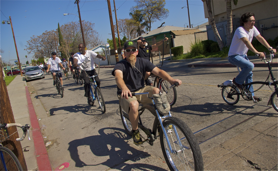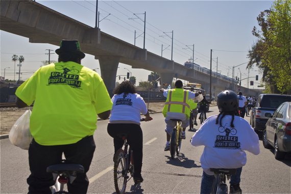 Banding together under the name “United Riders of South L.A.” and proclaiming “No Color Lines” as their tagline, they regularly organize unity rides, are active in supporting community-building events, have launched their own summer kickball league to keep youth busy on Friday nights, are working to pull more South L.A. bike clubs under the United Riders umbrella, and are building relationships with clubs from outside the area.