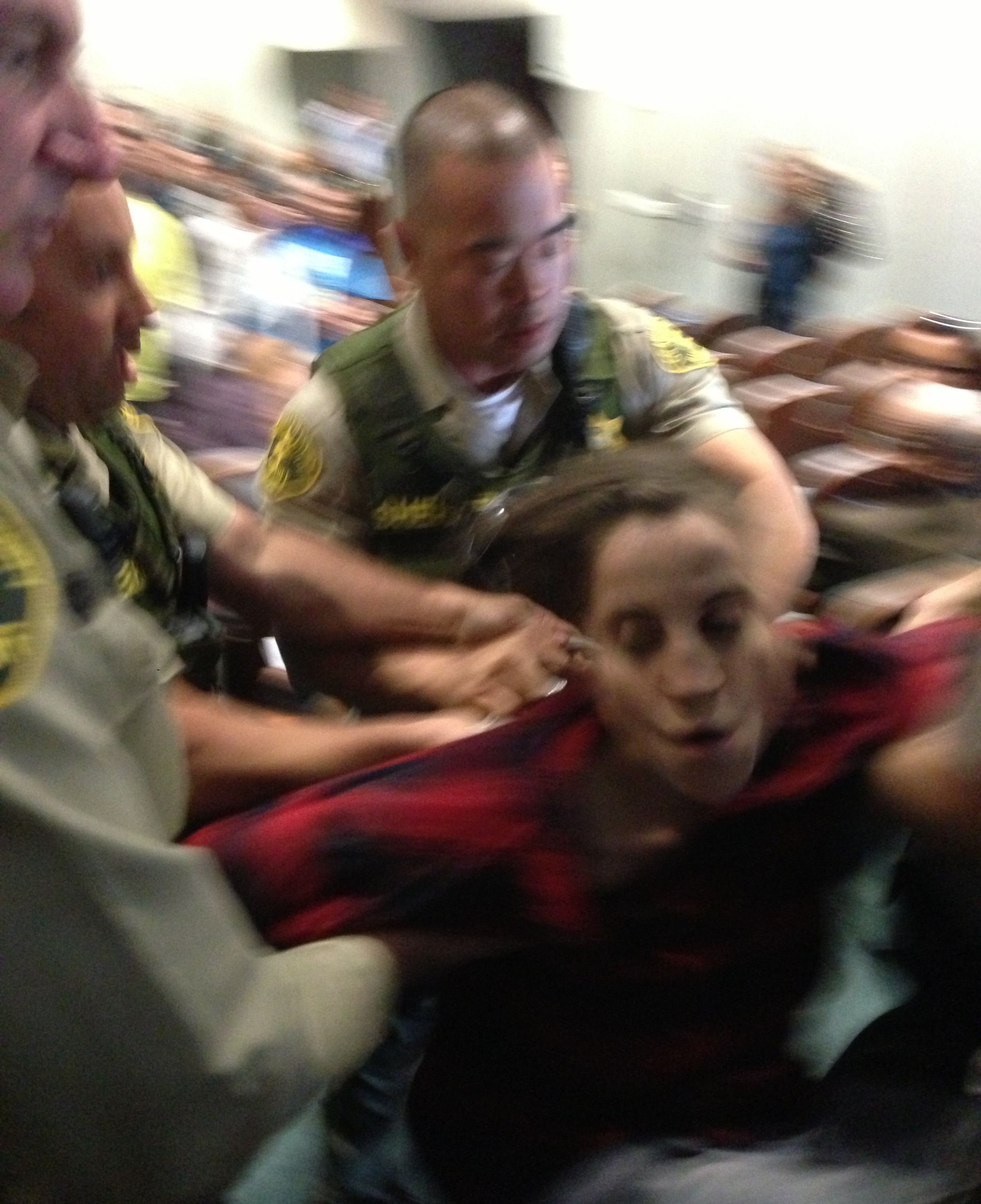 As the meeting wore on, a handful of speakers rebuffed the chair and finished their statements. When one speaker ignored the chair and spoke at length, DuBois threatened to have him removed for disruptive behavior. As multiple uniformed guards approached the speaker, he retreated to a seat. Other attendees surrounded the speaker to block approaching guards. The ensuing confrontation resulted in the speaker and another individual being removed from the meeting. See video of the incident here. The L.A. Times reported that the two were arrested “on suspicion of disturbing the peace.”