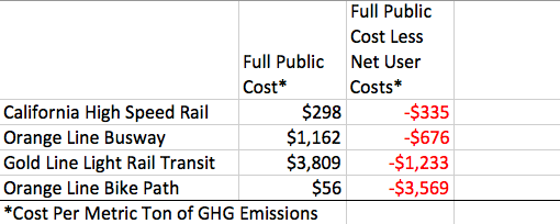 The new comparison of costs among high-speed rail, light rail, bus rapid transit, and the bikeway is shown in the table below. As discussed in our previous story on this report, the authors consider anything less than the current price of a metric tonne of emissions under the cap-and-trade system (about $11) a cost-effective way to reduce greenhouse gas emissions. The lower the cost, the greater the cost-effectiveness.