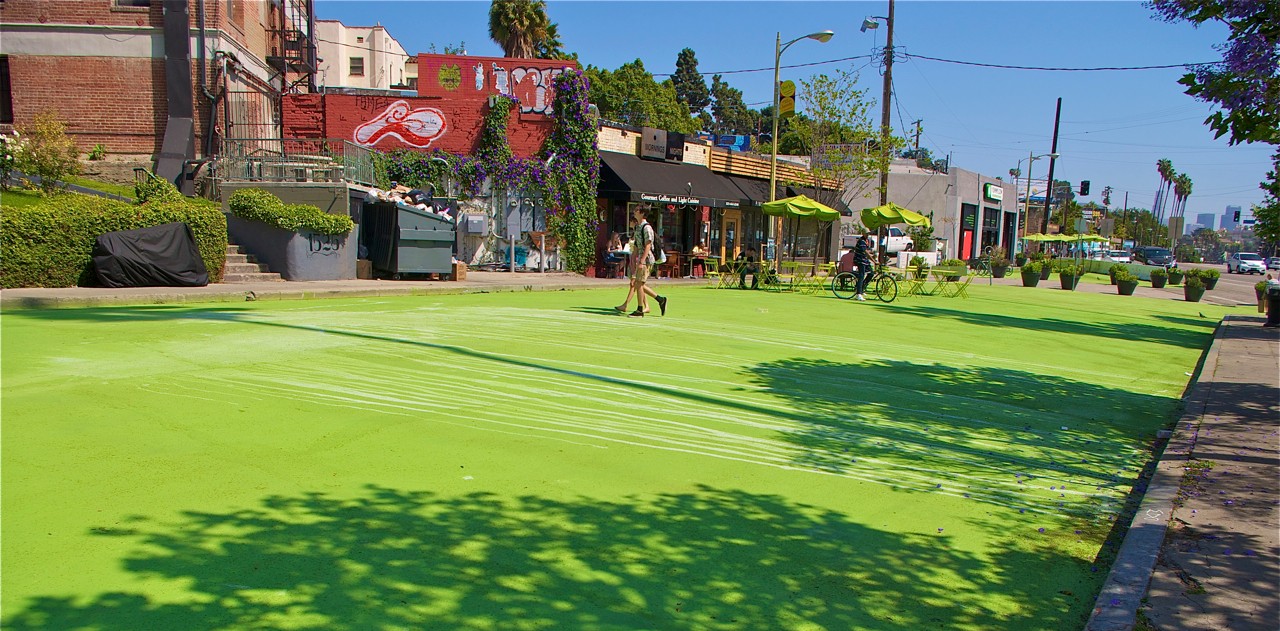 There’s a fresh coat of bright green paint on L.A.’s Sunset Triangle Park plaza! This space had been Griffith Park Boulevard roadway for many years. In early 2012, it was re-purposed to support local businesses, sitting, eating, walking, and bicycling.