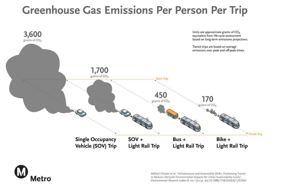 Metro’s First Last Mile Plan is part of its overall sustainability strategy. As the above chart shows, to the extent that people chose to take transit and/or bike, transportation’s environmental benefits increase. Walking is even better, though not shown in the above chart. Similar graphics could be developed for other pollution — air, water, noise — and for public safety, public health and more. For all these reasons, the first last mile priority is fostering walking and bicycling.