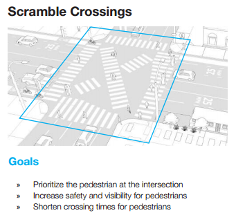 The plan then details an extensive toolbox of pedestrian and cycling facilities that would comprise the Pathway. These include nearly all of the livability improvements that Streetsblog readers know and love: mid-block crosswalks, signage, scramble crossings, landscaping, bus-only lanes, bike lanes, bike share, car share, even protected bike lanes, which the plan renames “rolling lanes”.