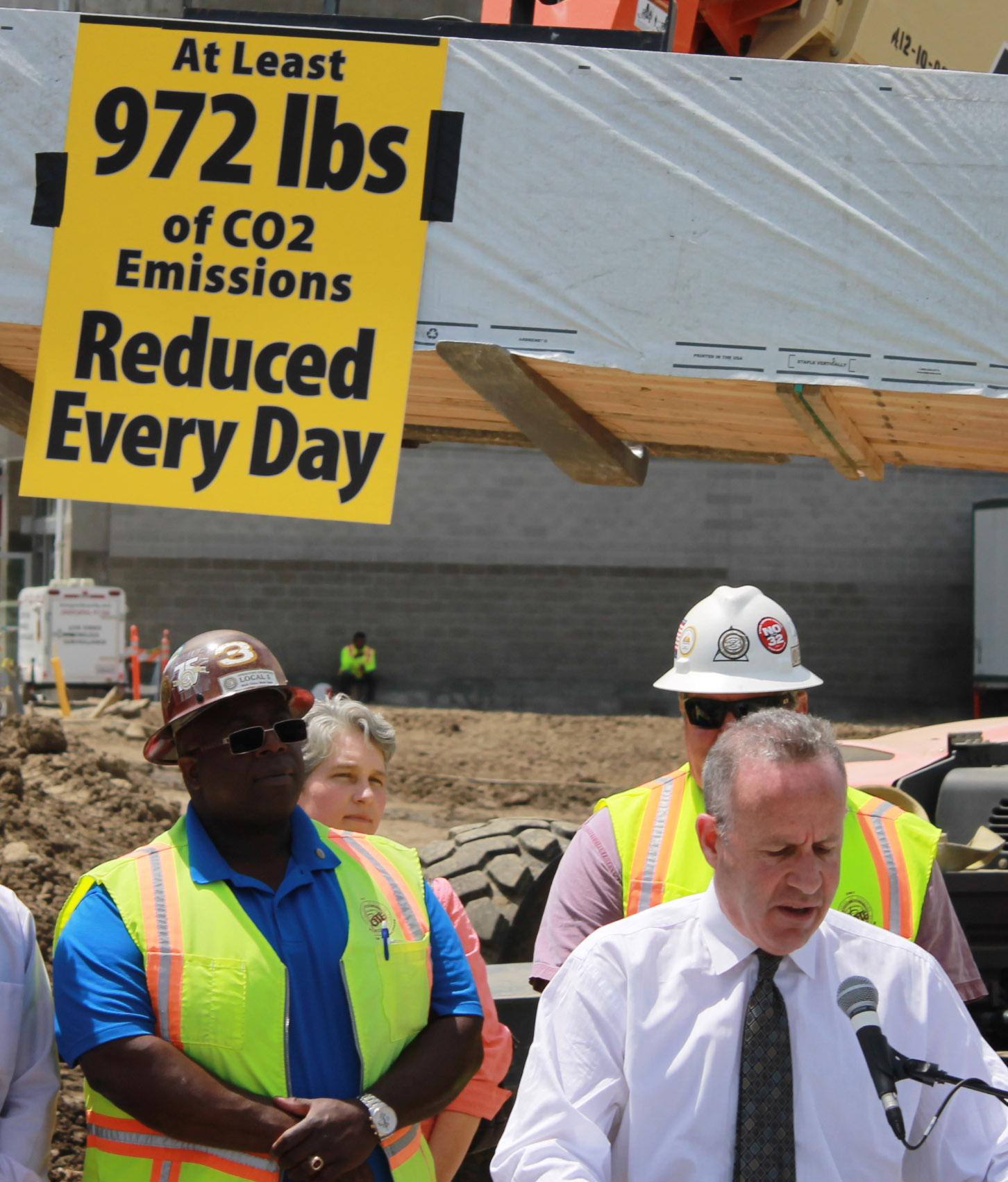 Behind him, a forklift raised a load of lumber high up in the air, with an attached sign reading, “At least 972 lbs of CO2 emissions reduced every day.” That’s the amount by which the housing project, which will provide 624 housing units next to the BART station, is estimated to reduce greenhouse gas emissions compared to other housing developments. Of those apartments, 108 will be leased at below-market rates.