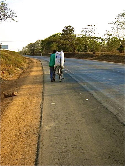 These two-lane roads are generally quite narrow, however, and it can be very uncomfortable for pedestrians, animal-driven carts, or cyclists to move along their shoulders as heavily-laden transport trucks rumble by.