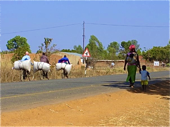 Men may load anywhere between 50-100 kilos of grain onto the back of their pushbikes while women may carry large loads of wood or other goods on their heads.