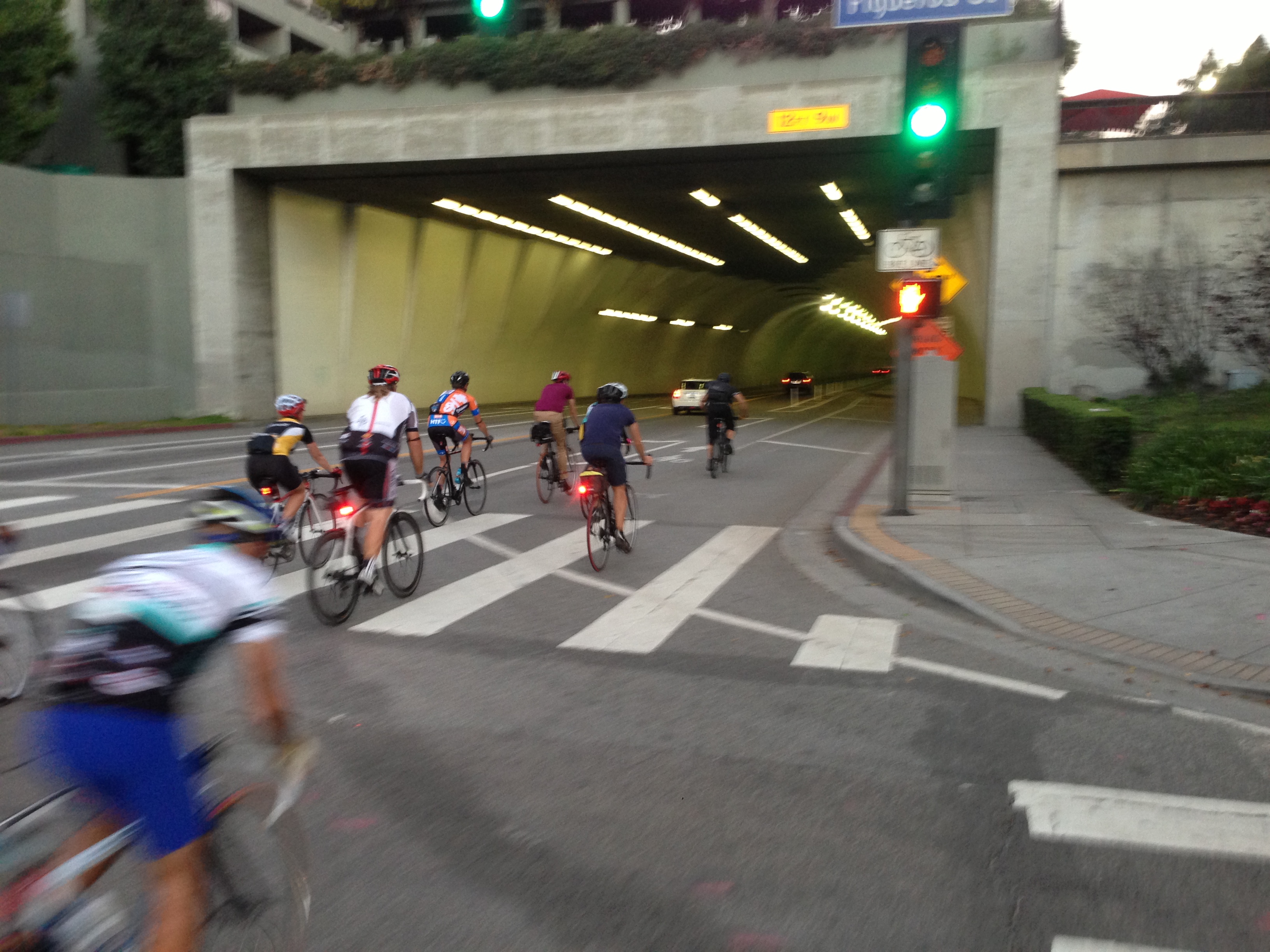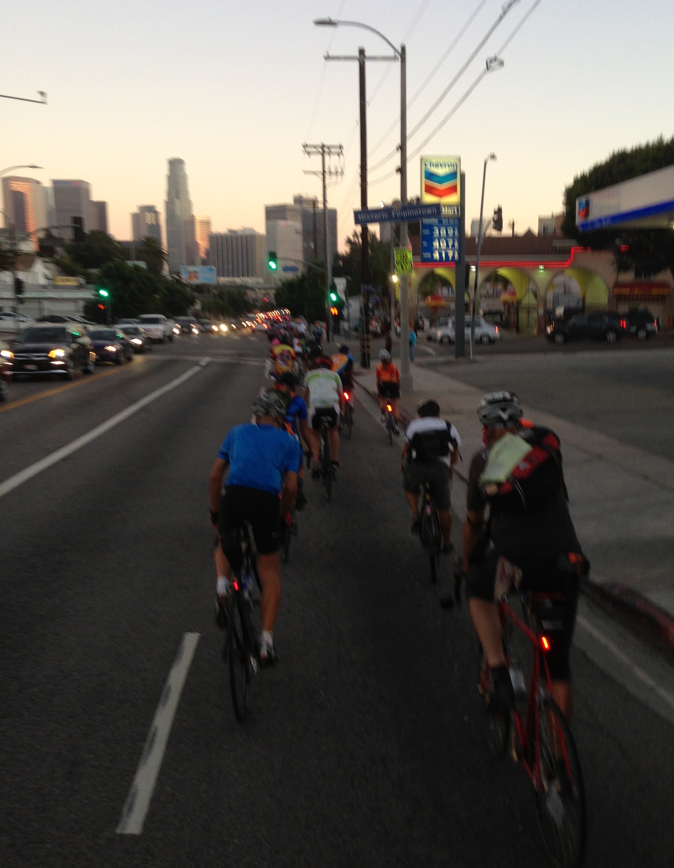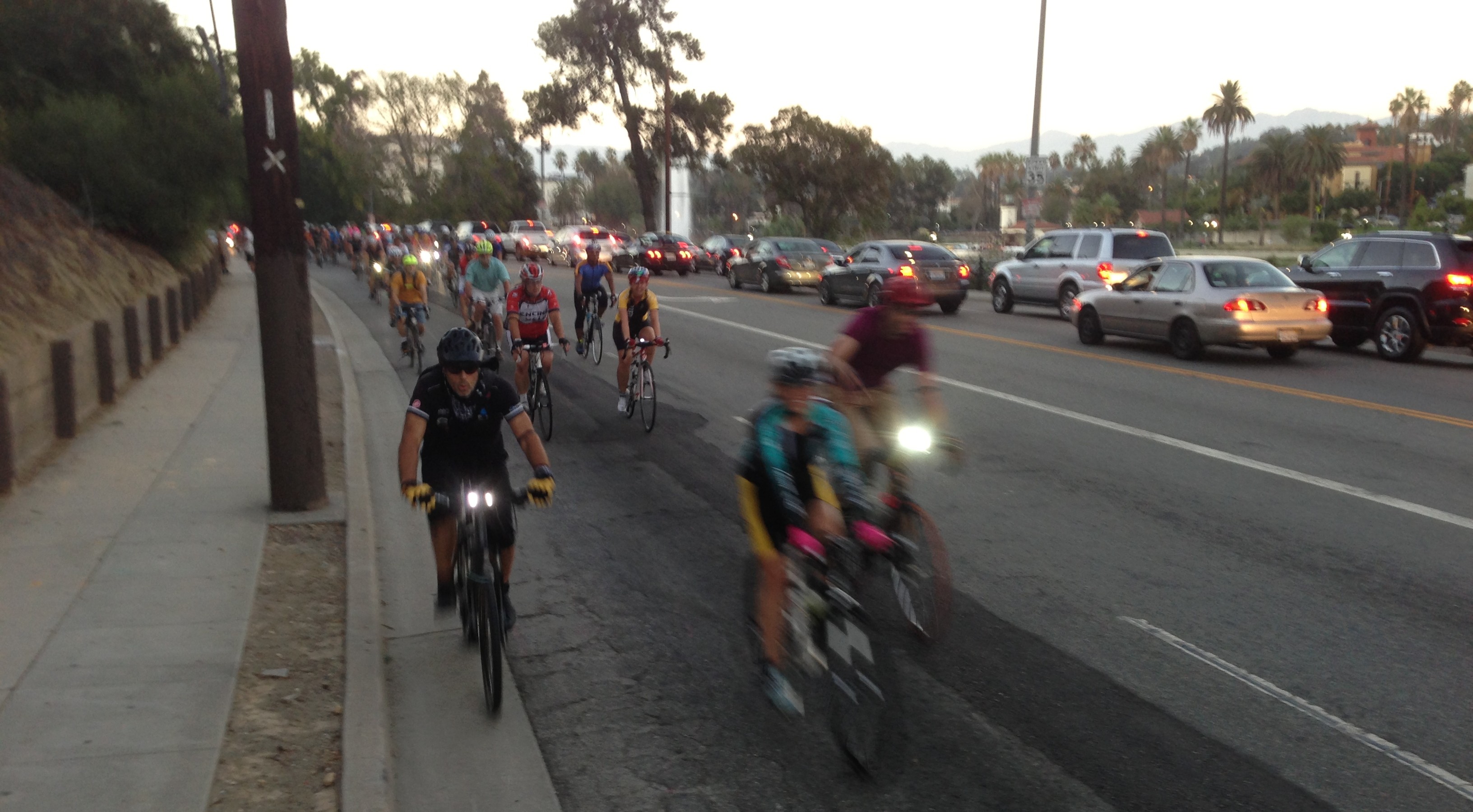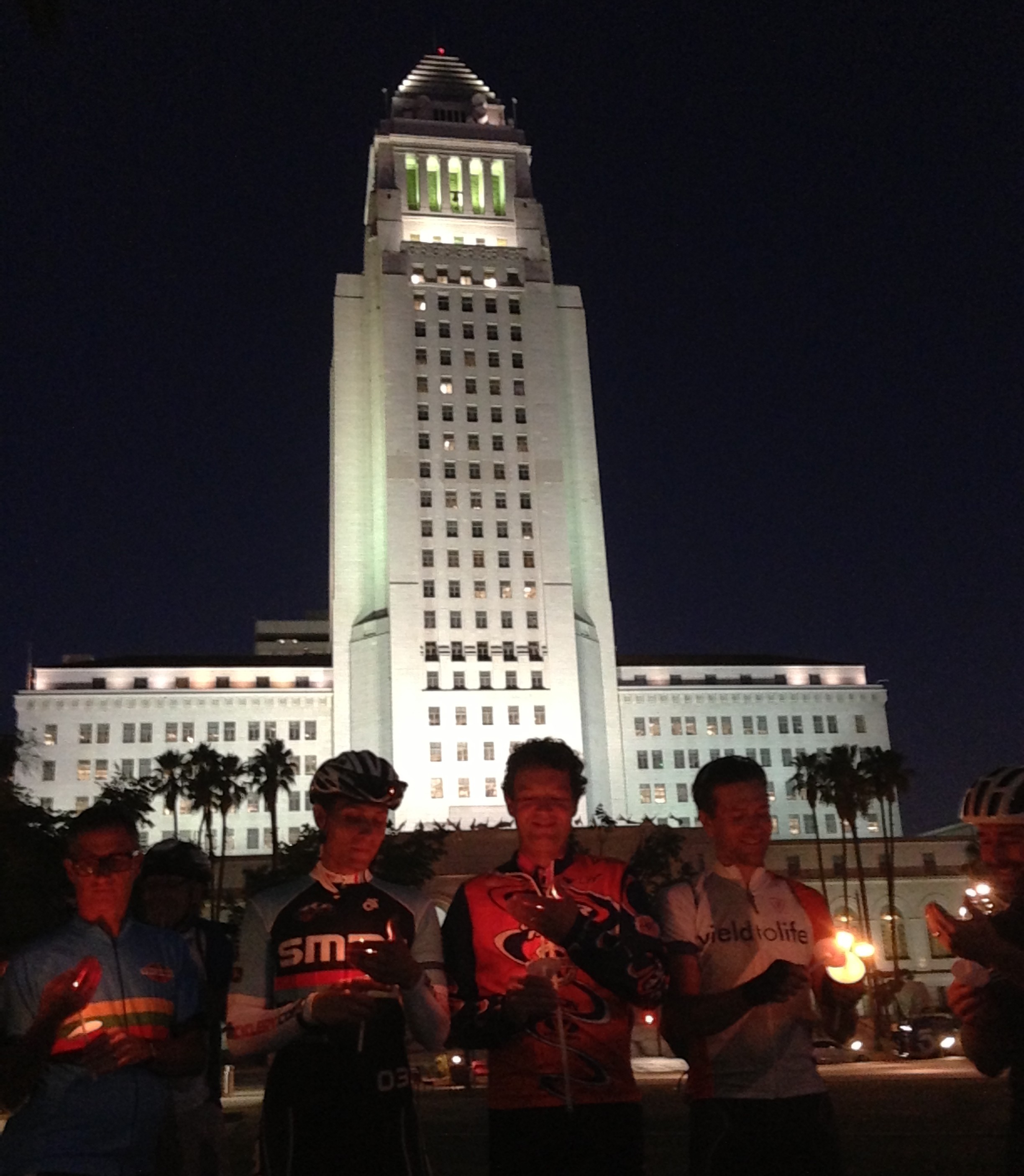 Yesterday’s ride started at the crash site in Calabasas, and rode 30 miles to the D.A.’s headquarters in downtown L.A. Roughly 75 riders were on the ride as it entered downtown, and the number swelled to roughly 125 for the vigil at Grand Park.