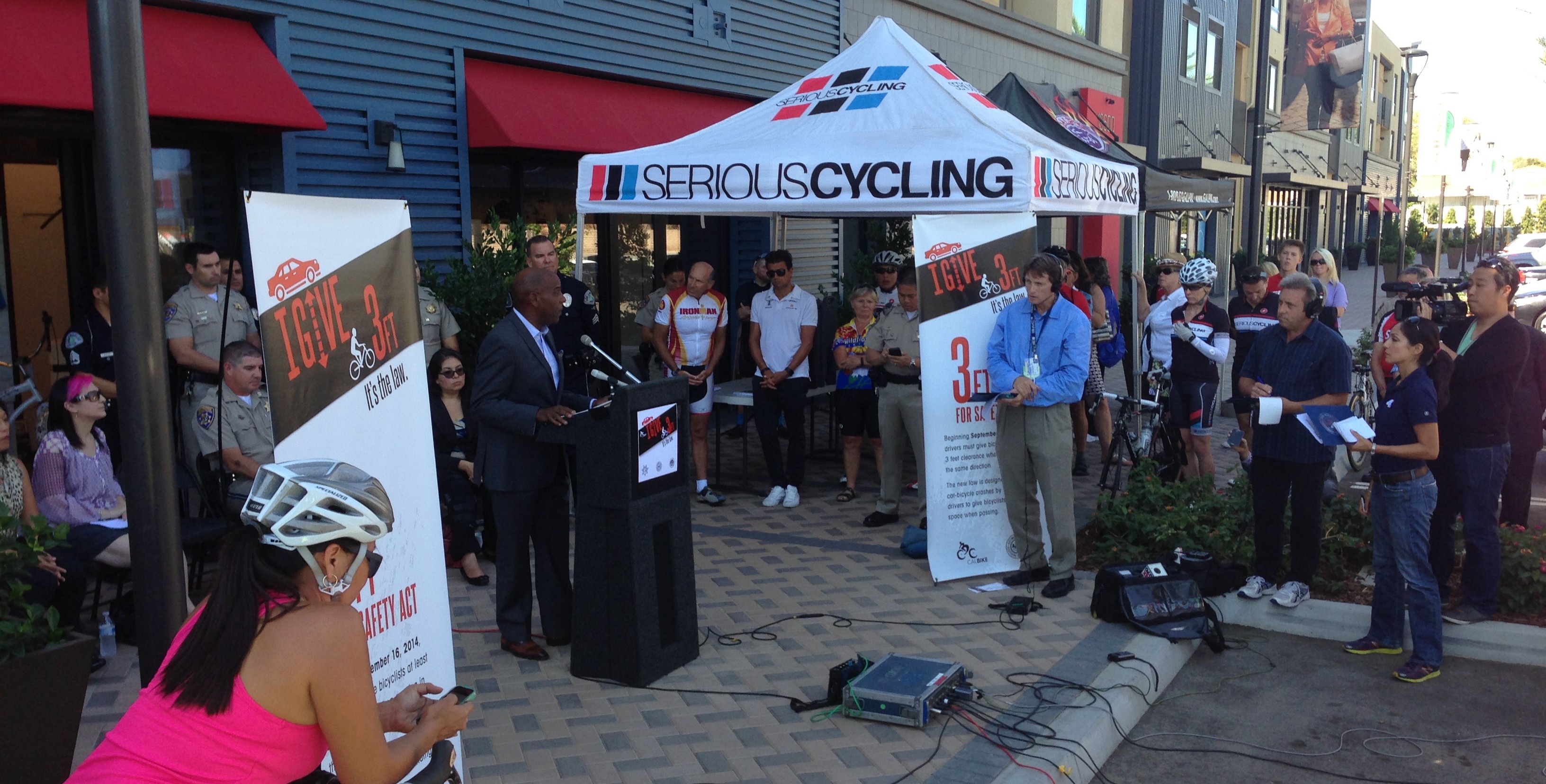 This morning, California legislators, law enforcement representatives, cycling advocates, and the Automobile Association of America (AAA) gathered to promote awareness of the state’s new 3-foot passing law. Long in the works, the Three Feet for Safety Act, A.B. 1371, goes into effect next Tuesday, September 16.