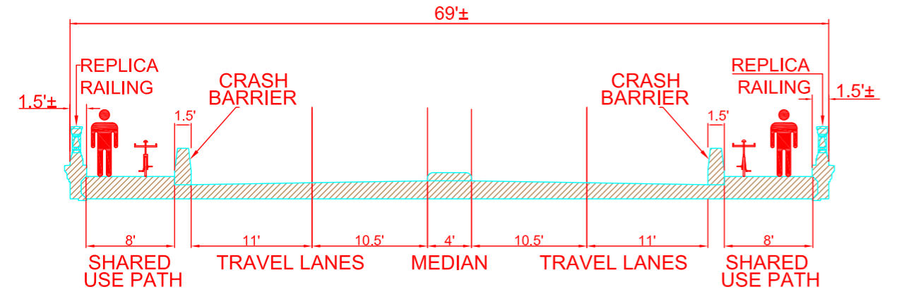Given the width of the bridge, there is not quite enough room for two sidewalks, two bike lanes, and four car lanes. LaBonge’s insistence on preserving four car lanes meant that either bike lanes or a sidewalk would be eliminated.