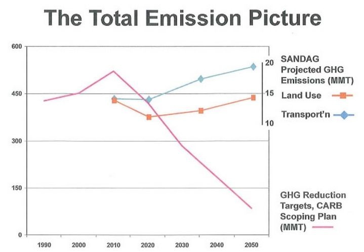 As Eric Jaffe at CityLab wrote, the story is told in one simple chart created by opponents of the plan, which shows that it projects that greenhouse gas (GHG) emissions would rise through 2050. The San Diego Association of Governments (SANDAG) apparently has no problem with that.