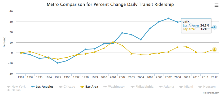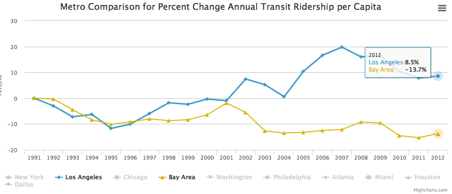 Comparing the Bay Area to Los Angeles, for example, shows that daily transit ridership in LA between 1991 and 2012 increased 24.5 percent, while the Bay Area only saw an increase of 3.2 percent (see chart above). The numbers on per capita transit ridership in the Bay Area are worse, with a 14 percent decrease over the same time period, while LA saw an 8 percent increase.