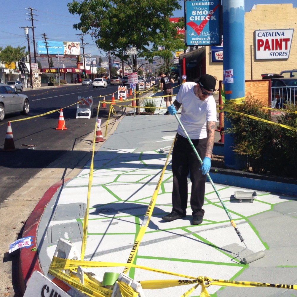 Great Streets roped in LA-Más to give Reseda’s sidewalks a new look. Think People St plaza, but beyond just polka dots. LA-Más crews and volunteers were out painting a flagstone pattern on sidewalks on the east side of Reseda Blvd between Rayen Street and Gresham Street. I jumped in and got my hands dirty painting a bit, too.