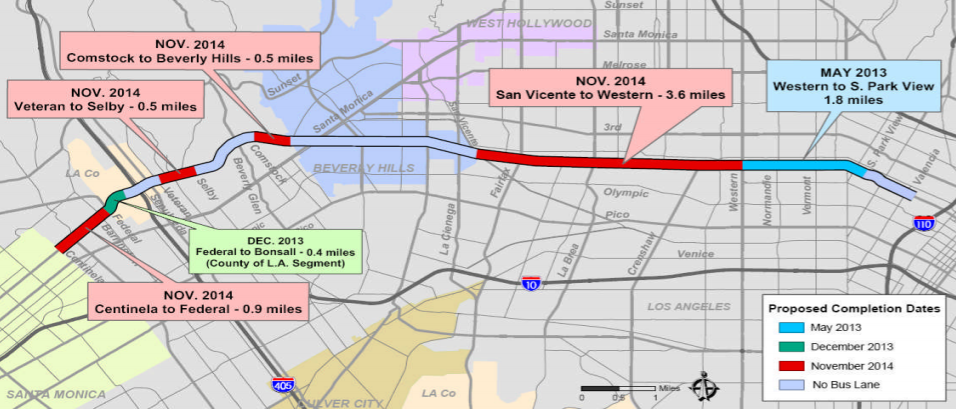 The final 0.9 mile segment, from Federal Avenue to Centinela Avenue, is expected to open in fall, 2015.