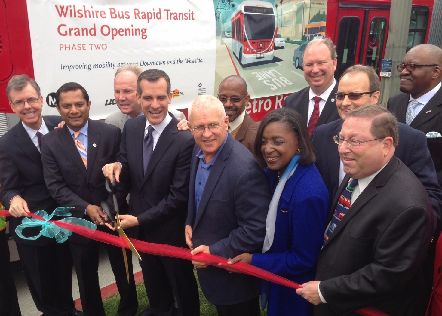Elected officials and agency representatives gathered yesterday to host a ribbon-cutting event for Wilshire Boulevard’s newest peak-hour bus-only lanes. The $31.5 million project, dubbed the Wilshire Bus Rapid Transit (BRT) is a joint effort of Metro, L.A. City, and L.A. County. The bus-only lanes operate from 7-9 a.m. and 4-7 p.m.