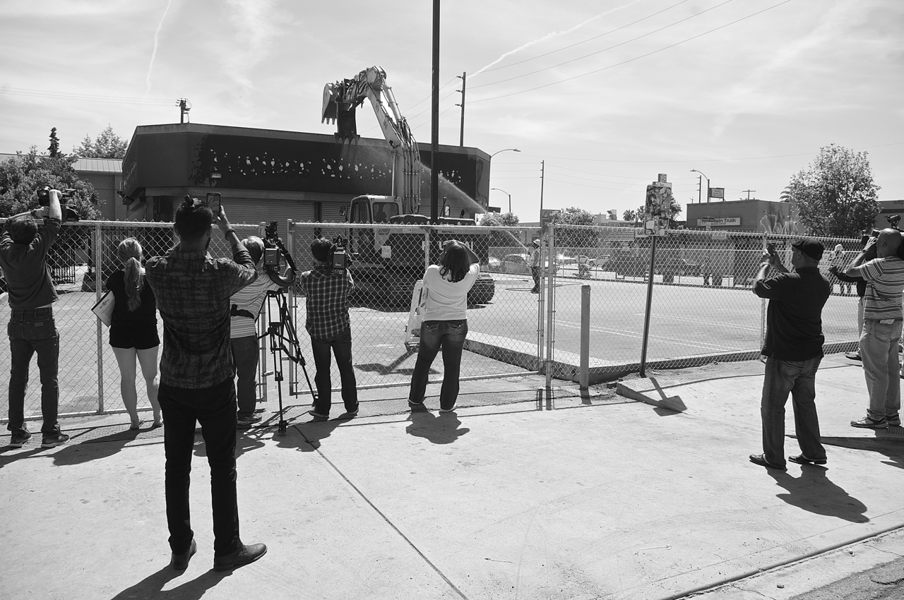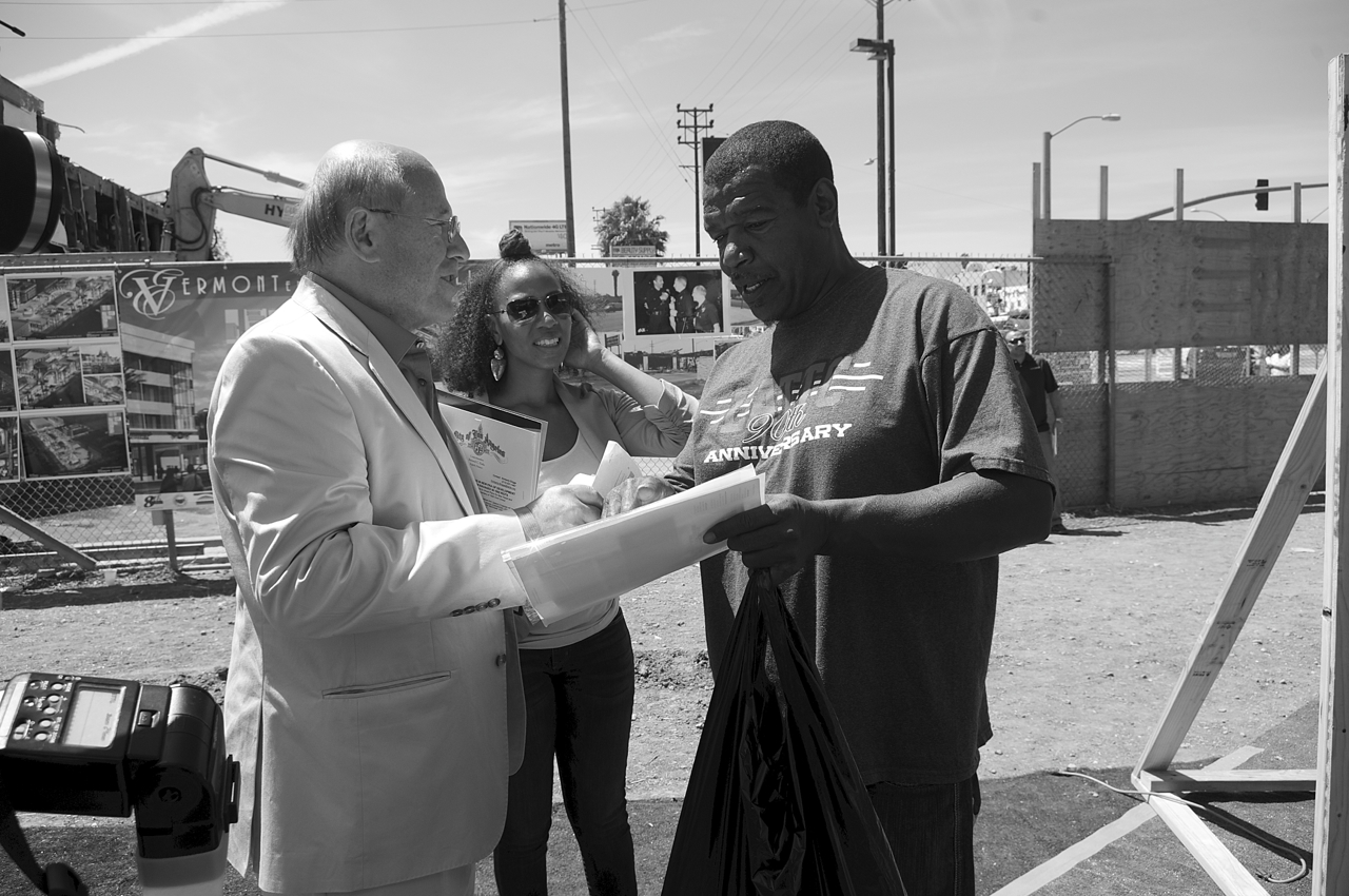 A man outside the fence recalled having been hired to do clean-up work on the lot several years back. Another man said he rushed down to the site on his bike after seeing mention of the groundbreaking on the news that morning. A woman standing with her daughter — who had been born shortly after the riots — recalled watching the swap meet burn. A young man sporting tattoos marking his affiliation said he knew it was a great day for them to begin the project because it was his birthday. And a man who had been managing the residential hotel across the street for the last 5 years said he couldn’t wait for the project to be finished — it was needed in the community.