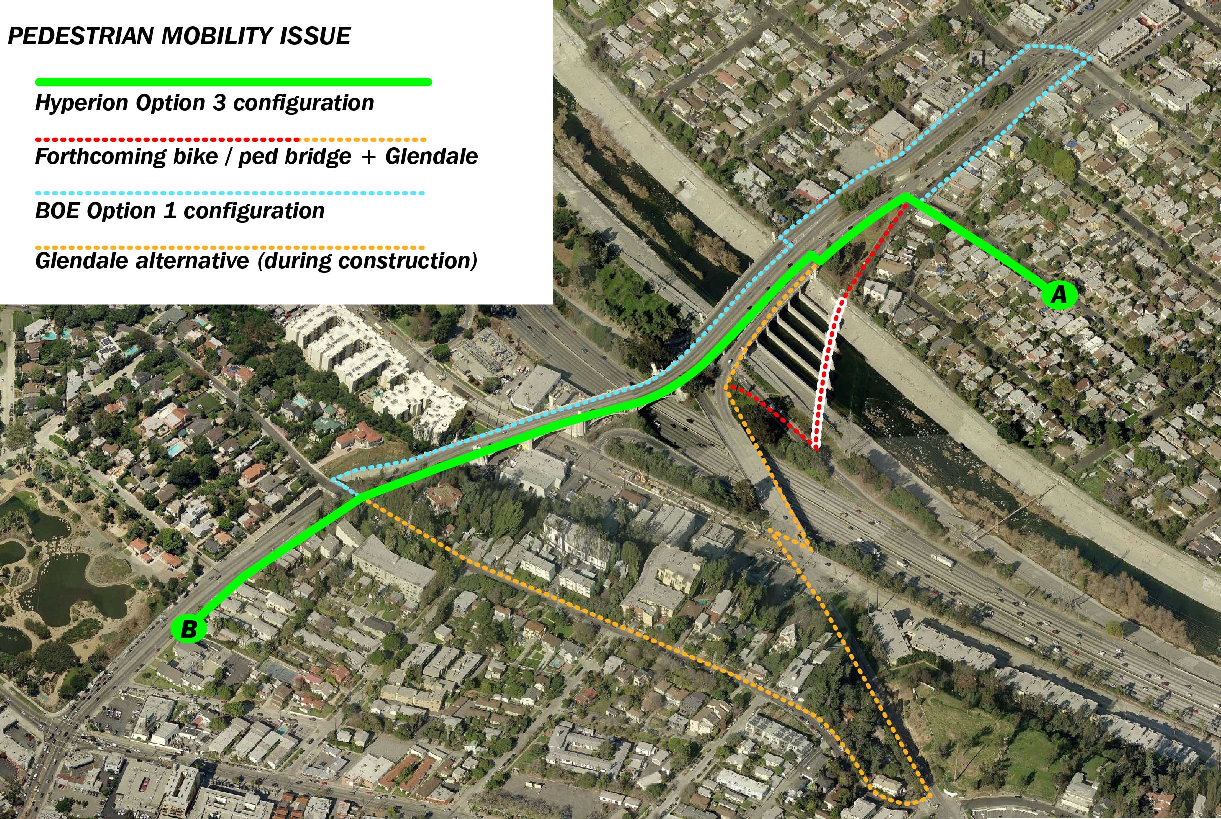 I made this chart to explain the route of an actual petition signer in Atwater who walked from her house (approximate location A) to her church at B. She was interested in safer access to the south sidewalk and did not want to have to walk an additional half mile or so to get to her destination. The shortest possible route under Option 1 would include walking up a steeper incline to the top of Waverly to get across Hyperion on the Silver Lake side.