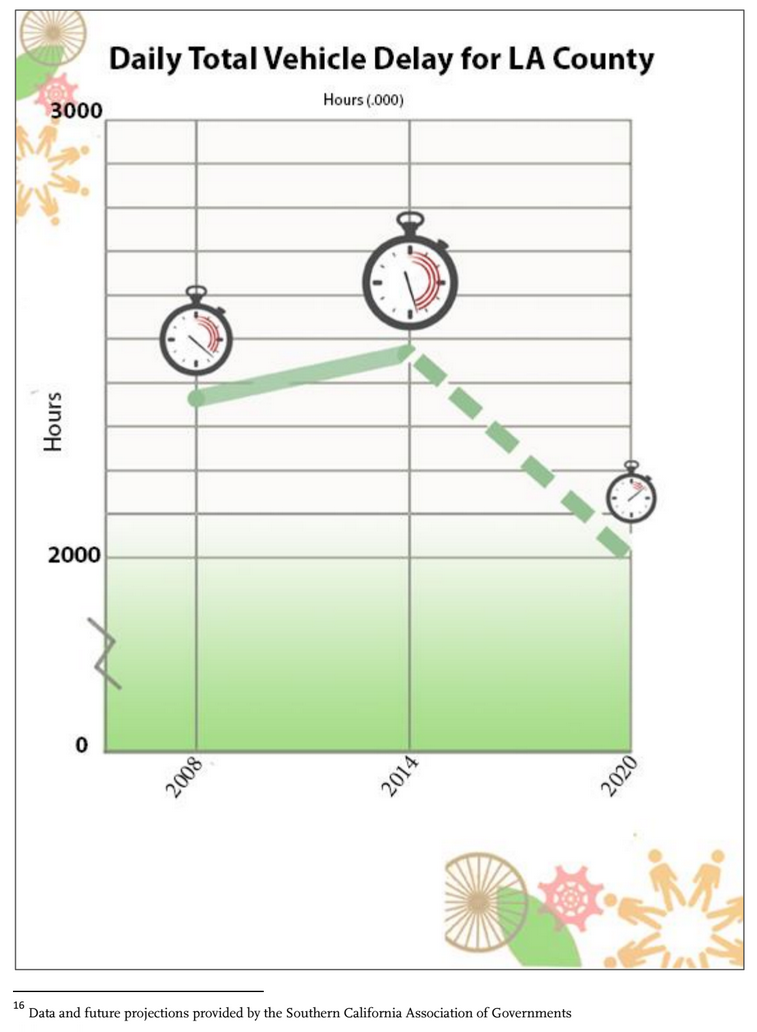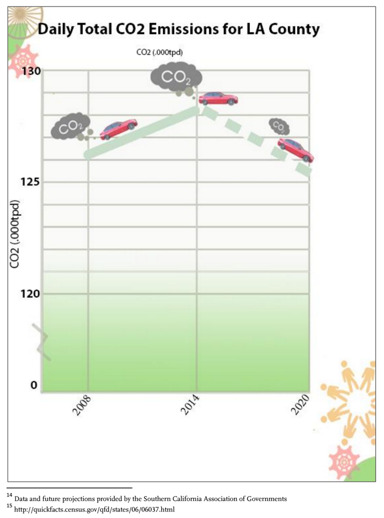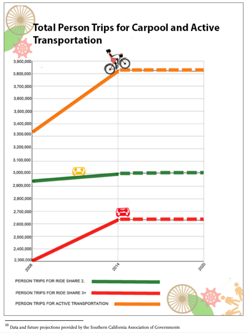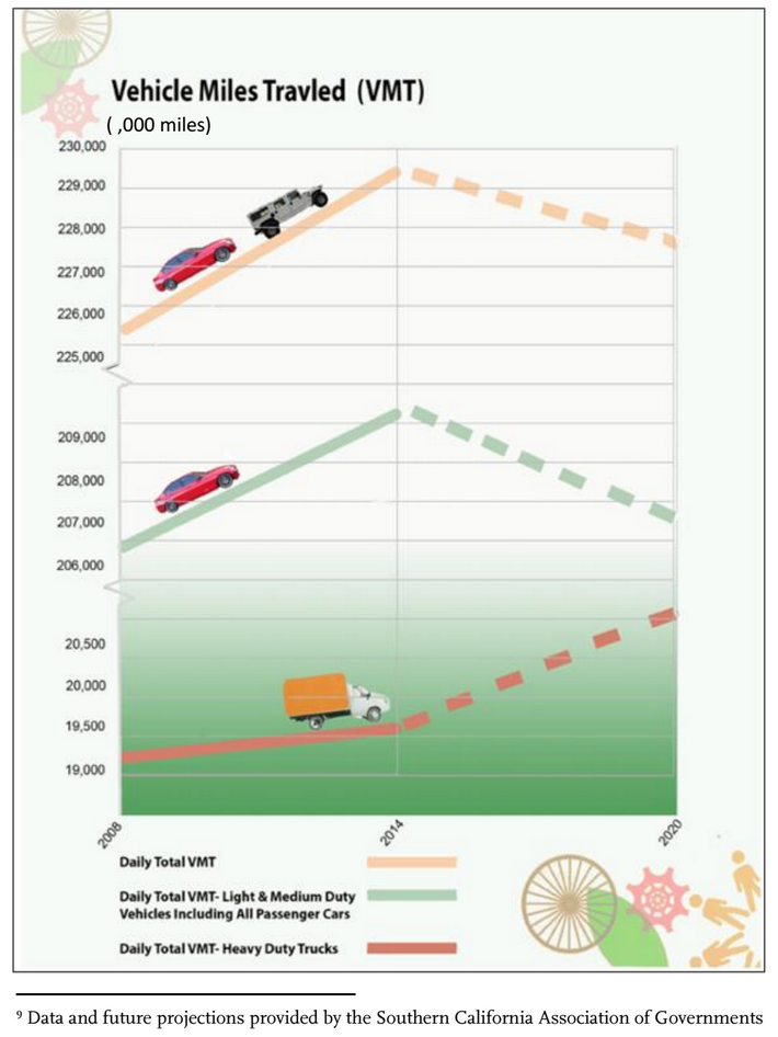 The bulk of the report is a series of graphs showing Countywide Performance Metrics, including Vehicle Miles Traveled, Total Person Trips for Carpool and Active Transportation, Daily Total CO2 Emissions for L.A. County, Metro Transit Ridership Total Annual Boardings, and more. Each of these metrics are shown on graphs, most of which SBLA has included below in the order in which they appear in the report.