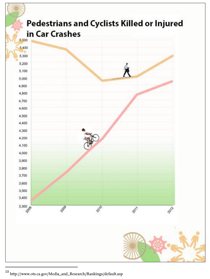 Examples of metrics that could benefit from refinement would be bicycle and pedestrian injuries and deaths. It can be somewhat misleading to show just the absolute number of injuries and deaths, without taking into account how many people are utilizing a mode. If, for example, bicycle trips triple and bicycle deaths double, then the number of deaths per trip is actually declining even though the overall number of deaths is increasing. Similarly, other absolute numbers including transit ridership and VMT, could also be reported as modal share percentage and per-capita respectively.