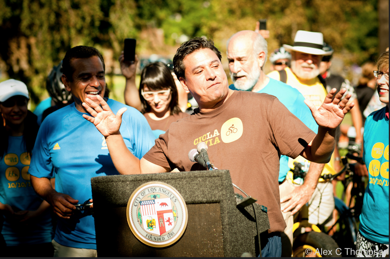 Councilmember Jose Huizar set a Streetsie record by garnering over 5,000 votes in his race against Joe Buscaino for the 2014 Streetsie award. Heck, Huizar got more votes for his Streetsie than Molina did in the City Council election. The award is well-deserved, as Huizar’s Council District 14 is home to many of L.A.’s “firsts”: first green buffered bike lane, first parklets, first bike corral, etc…