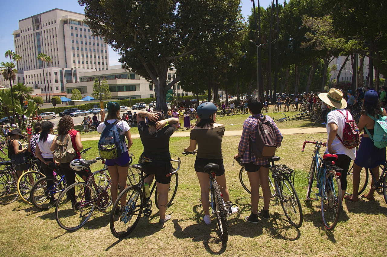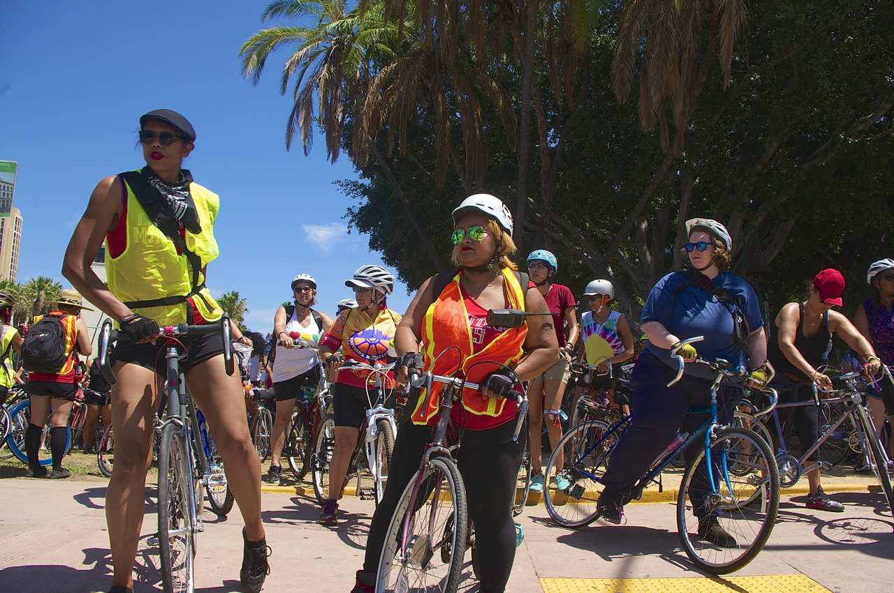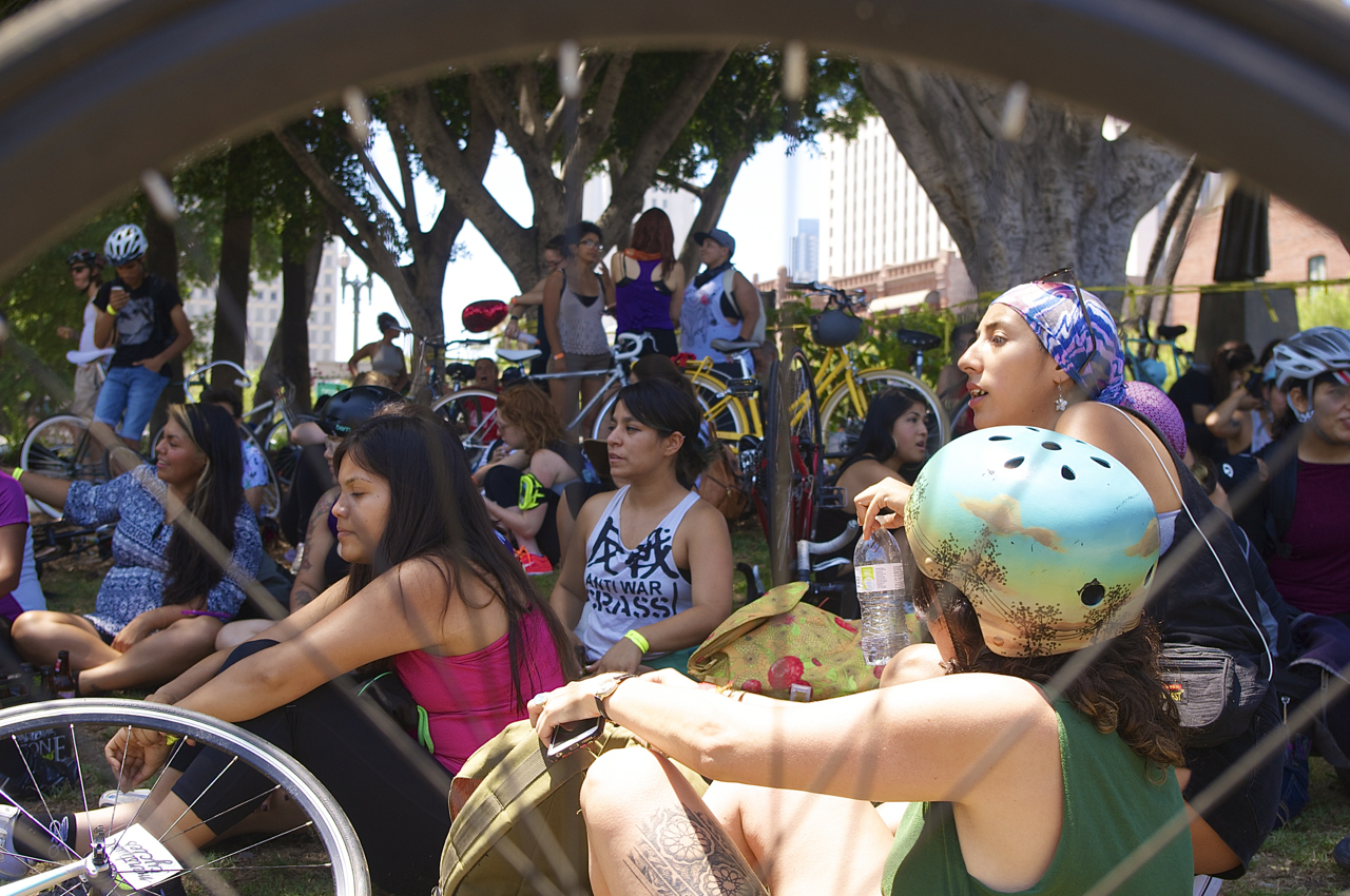 Looking out over the growing group of women and women-identified folks gathering on the grassy knoll behind Olvera St. for the Ovarian Pscyo-Cycles 4th Annual Clitoral Mass ride, I realized that, despite having attended the previous three events, I only recognized a handful of the riders.