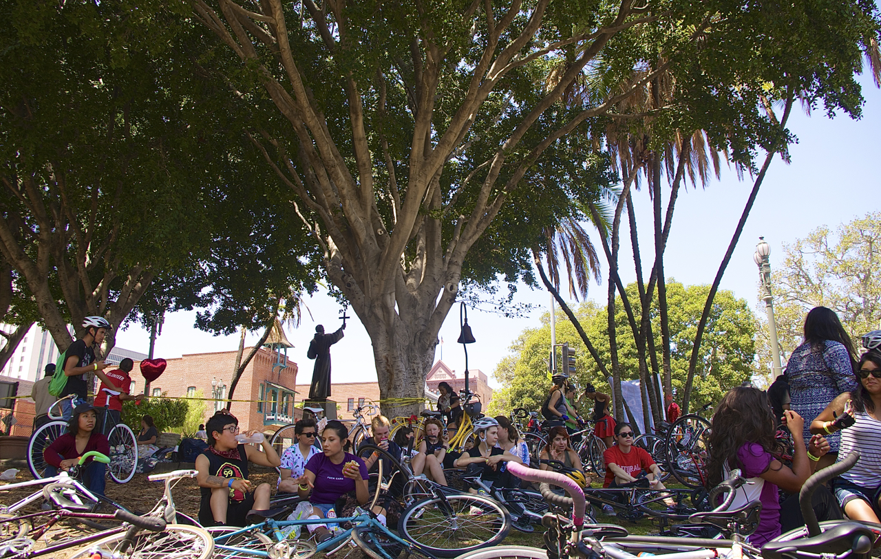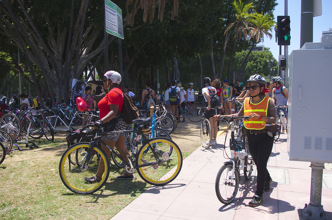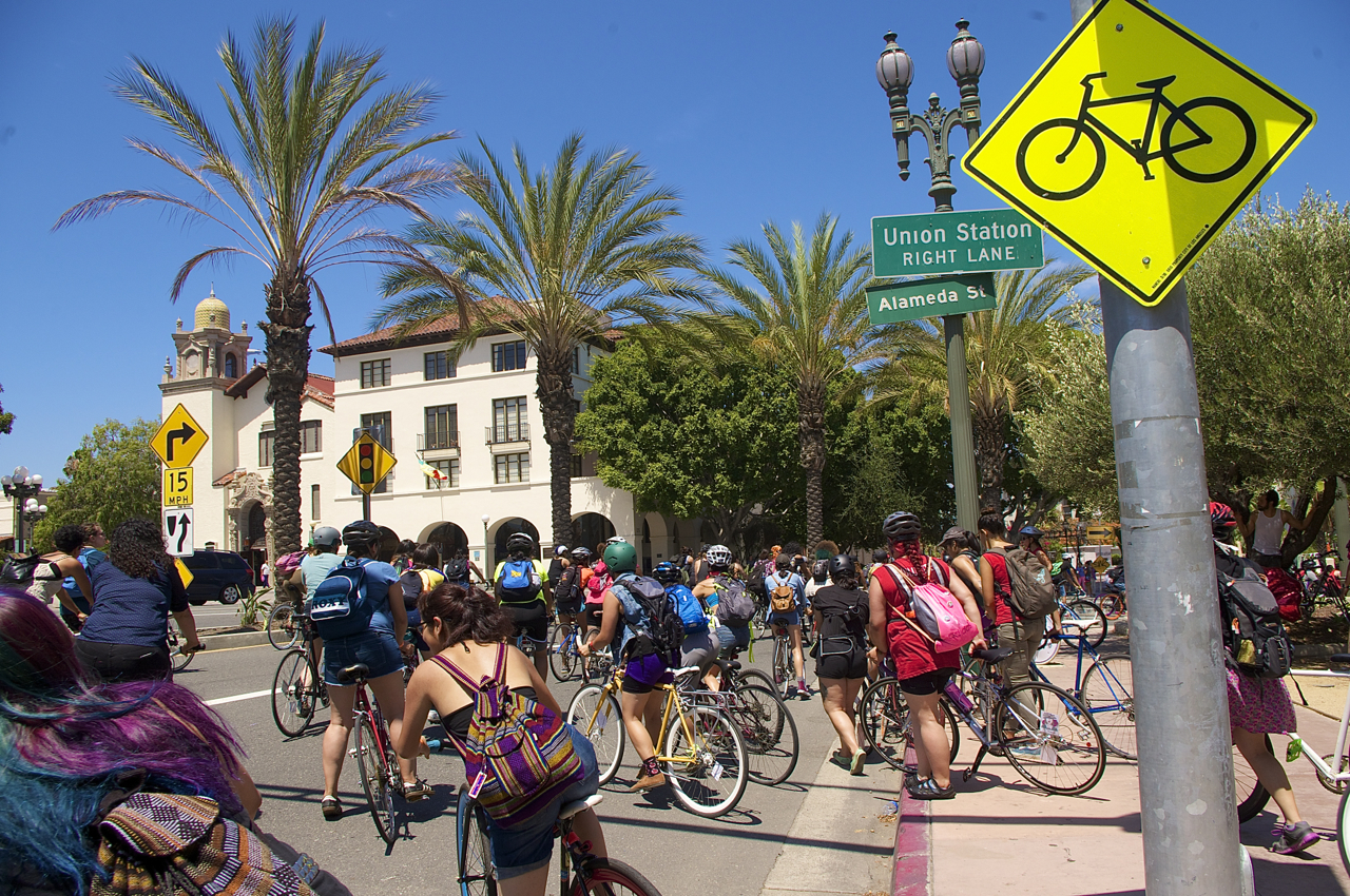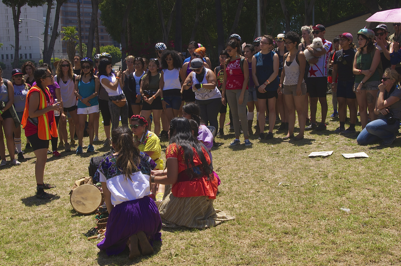 Looking out over the growing group of women and women-identified folks gathering on the grassy knoll behind Olvera St. for the Ovarian Pscyo-Cycles 4th Annual Clitoral Mass ride, I realized that, despite having attended the previous three events, I only recognized a handful of the riders.