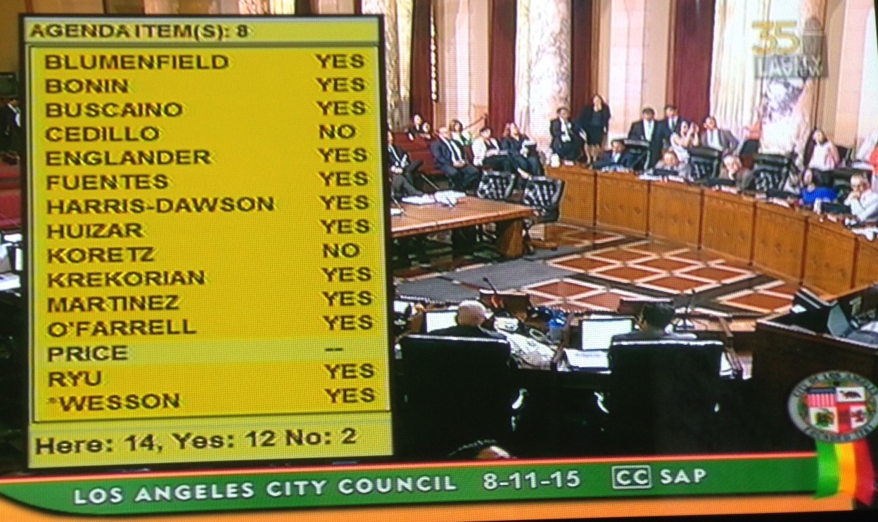 - Councilmember Koretz continued to press til the last moment to remove Westwood Boulevard from the bikeway network. Ultimately, he forced a vote, which lost with only three councilmembers in support.