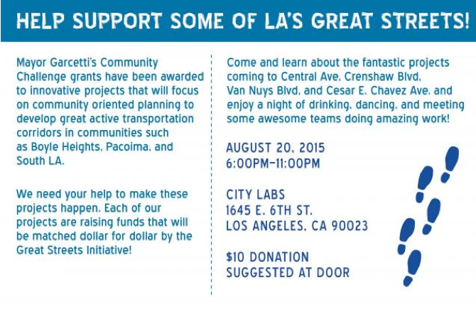 Support these or other challenge grant winners on ioby, here. Or attend a fundraiser at City Labs on August 20th and learn more about the projects slated for Central Ave., Crenshaw Blvd. Cesar Chavez Ave. and Van Nuys Blvd. in person. Details below.