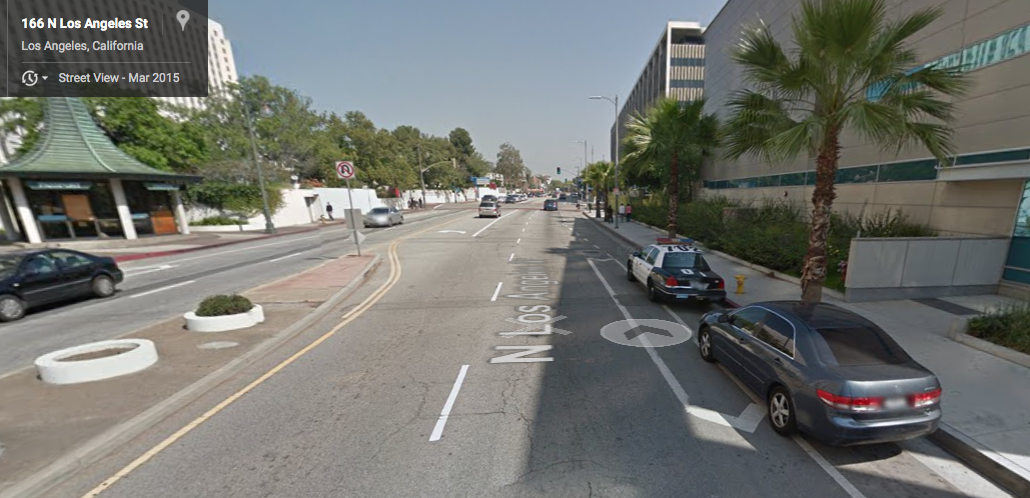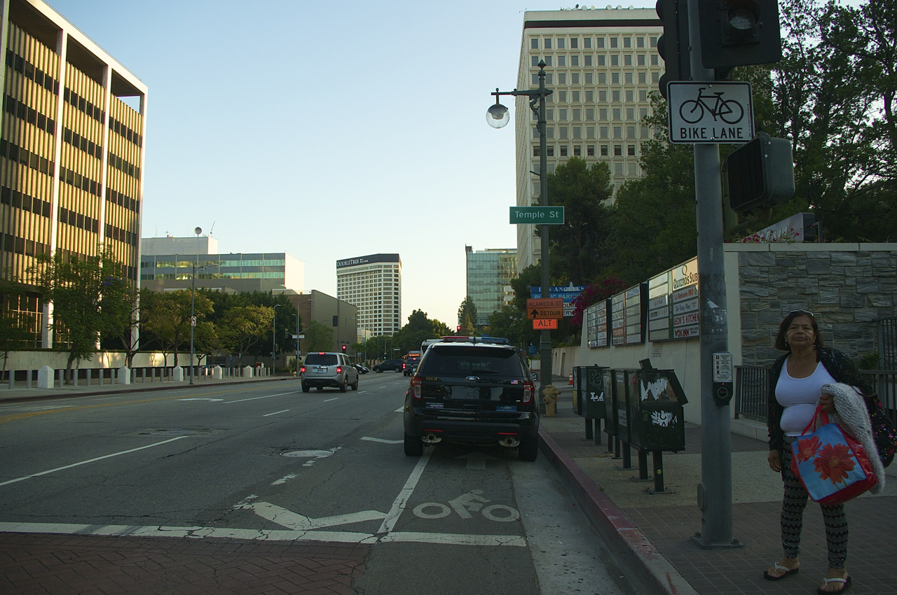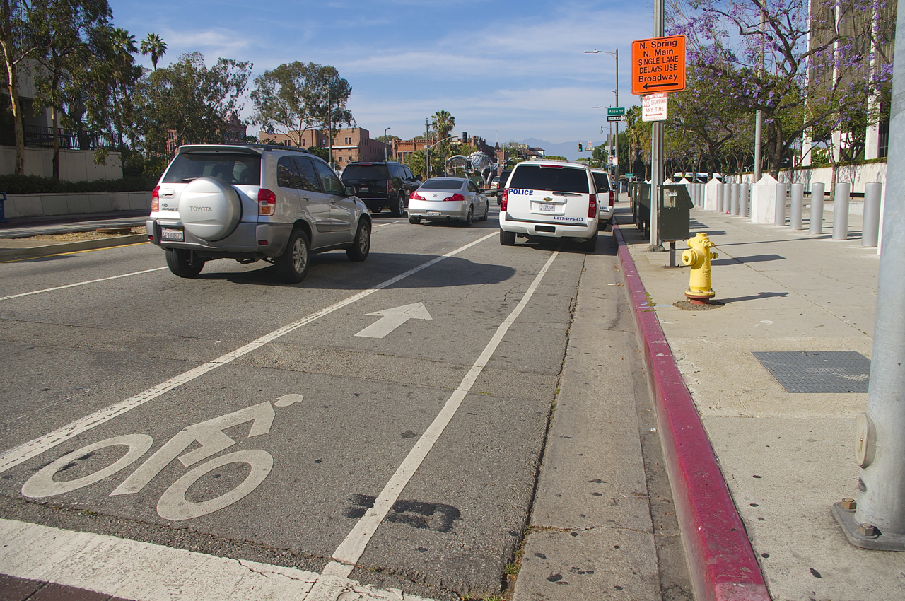 The lanes along Los Angeles St. between 1st and Aliso Streets are regularly blocked, usually by official vehicles that sit there all day, I gestured to the line of cars parked ahead of him, including an LAPD cruiser. The presence of the cars in the bike lane, I explained, meant that cyclists were forced to move into what could be a very fast-moving traffic lane on an often busy street.