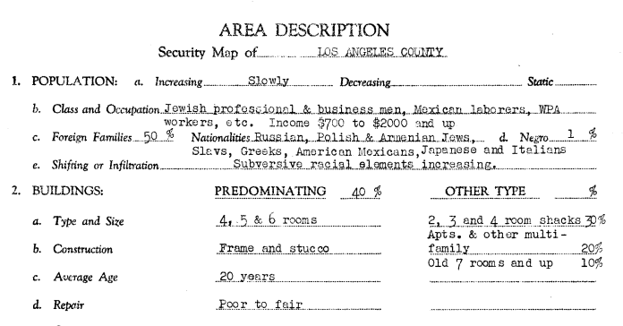 In 1939, the federally-sponsored Home Owners’ Loan Corporation (HOLC) described the neighborhood as “hazardous residential territory” with “diverse,” “subversive,” and “detrimental racial elements” lurking on every block. As such, it accorded the area a “red grade,” signalling to private banks, real estate agents, and mortgage lenders that this was “no place for upstanding citizens to purchase a home or get an easy loan.”