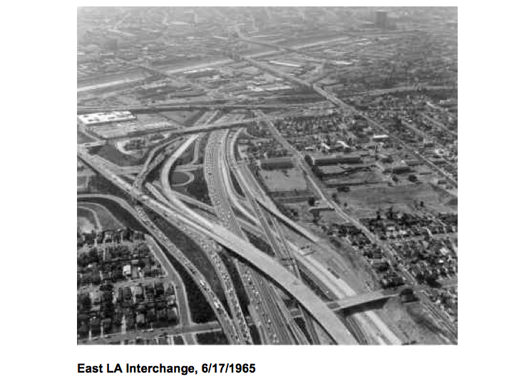 Not only would the community be almost entirely encircled and divided up by ribbons of freeways (below), but the pollution generated by the approximately 874 million vehicles that traverse the interchange every year would gift generations of its residents with respiratory and other health issues.