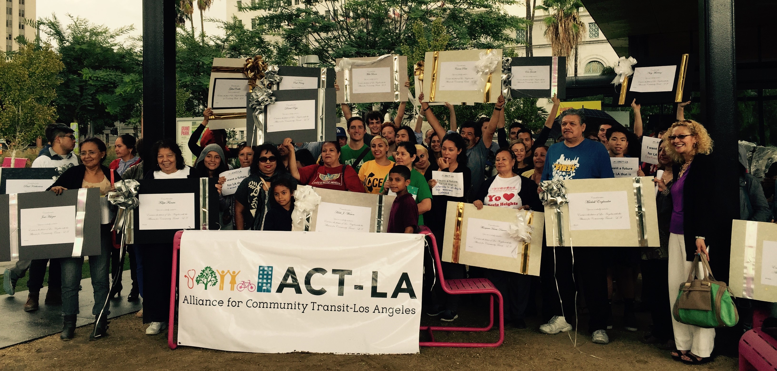 Formed in 2011, ACT-LA is an alliance of more than 25 non-profit organizations working in the fields of affordable housing, economic development, environment, public health, social justice, and transportation. The full listing of ACT-LA member groups is available online; it includes many organizations Streetsblog readers may be familiar with: East L.A. Community Corporation (ELACC), Koreatown Immigrant Workers Alliance (KIWA), Little Tokyo Services Center, Natural Resources Defense Council (NRDC), Public Counsel, Southeast Asian Community Alliance (SEACA), Strategic Actions for a Just Economy (SAJE), Pacoima Beautiful, Investing in Place, L.A. County Bicycle Coalition (LACBC), and many others.
