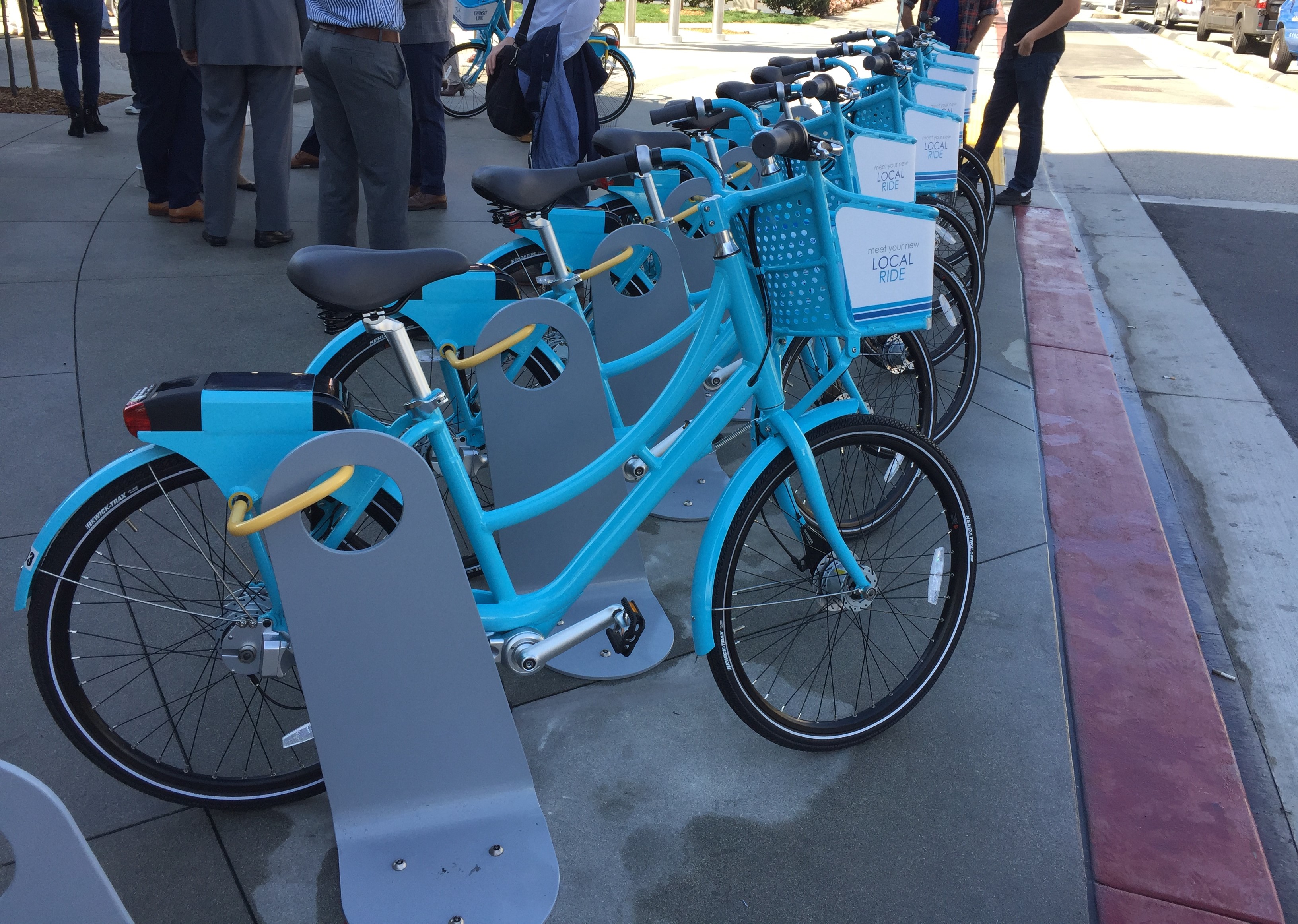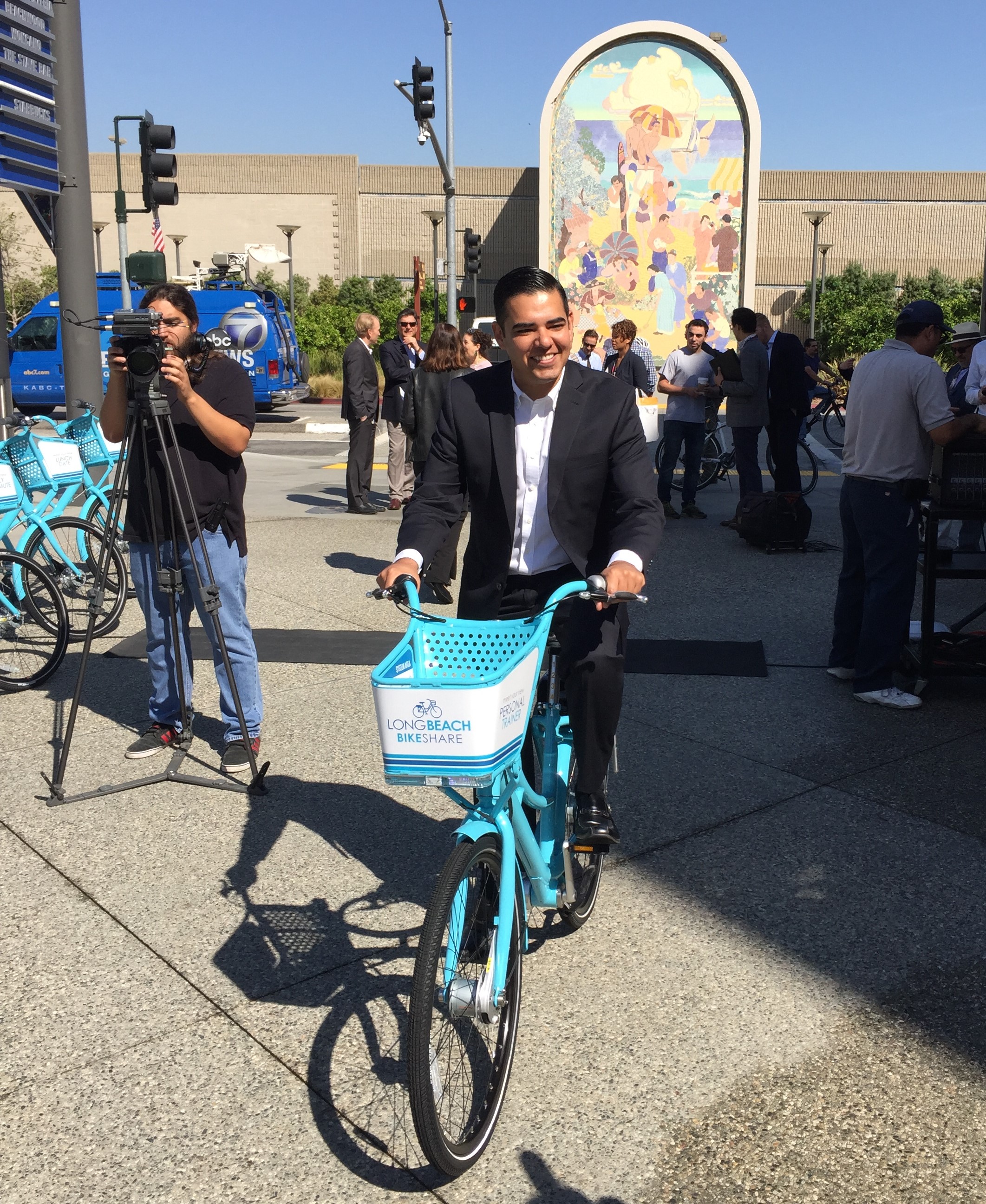 At a kick-off event this morning, the city of Long Beach celebrated a soft launch of its new bike-share system, called Long Beach Bike Share. There are currently two stations in operation, with a dozen bikes. The system will fully publicly open at the Saturday March 19 Beach Streets open streets event.