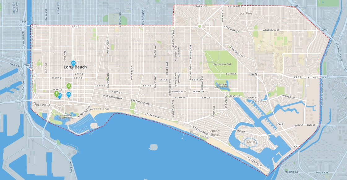 By March 19, the bike-share system will have 100 bicycles available; this will expand to 500 bikes at 50 stations this summer. The service area covers roughly the southern half of the city of Long Beach – from the L.A. River to the San Gabriel River, between the Pacific Ocean and Pacific Coast Highway/Stearns Street.
