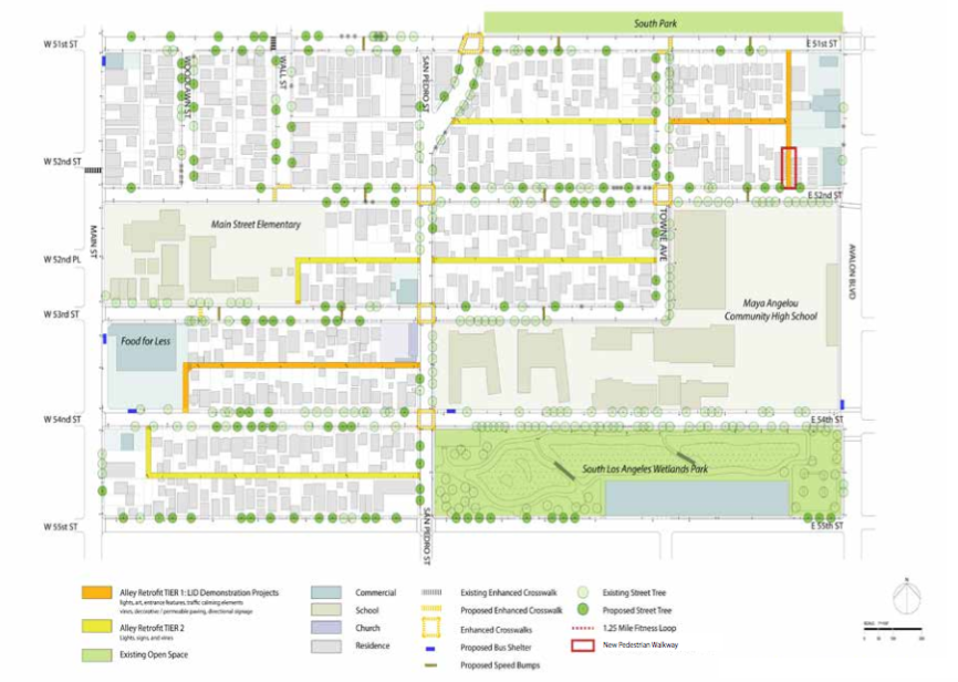 Once complete, the alley network squeezed between South Park and the South Los Angeles Watershed Park should help make it easier for youth and families to move more easily and safely between home, two schools, the grocery store, and the two parks.
