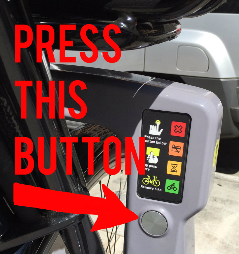 Lastly, here is a brief public service announcement for anyone new to the Metro Bike Share system. The dock directions say to “press the button below.” On my first try, I kept pushing the square green bike symbol, which I thought looked like a button. The button to push is the bigger silver round metal below. Heed my instructions and you may save yourself a few seconds of frustration.