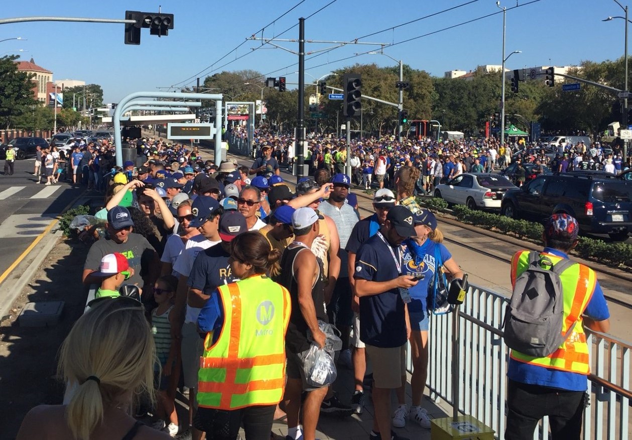 - First, kudos to Metro for already doing a good job managing football crowds. During during pre-season games, Metro anticipated and managed serious crowds. Metro promoted transit to get to games, added signage, increased service on the Silver and Expo lines, and deployed staff to manage queues. According to a staff report [PDF], Metro transit carried 10,600 and 12,200 riders to the Rams preseason games, representing 13 and 20 percent of the attendance.