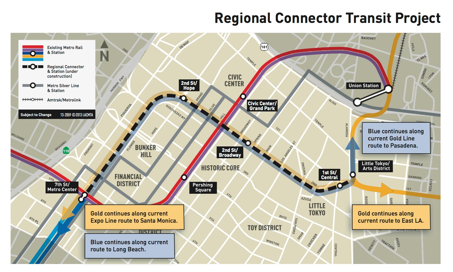 The Regional Connector will be a 1.9-mile light rail subway with three new stations in downtown L.A. It will connect Metro’s Gold, Blue, and Expo light rail lines. The project had some early stutters resulting in some cost increase and time delay. The line is now expected to cost $1.55 billion and to open in 2021.