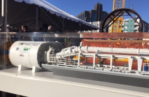 The TBM is a big device, more or less a train itself. Once fully assembled, it is 400 feet long; Metro’s handy TBM fact sheet points out that this the length of ten school buses. It weighs 1,ooo tons. The front end features a rotating “cutter head” that acts like a giant cheese grater. Behind the head are conveyor belts that carry dirt to the tail of the machine. The machine digs, builds the circular concrete, and lays train tracks as it goes.