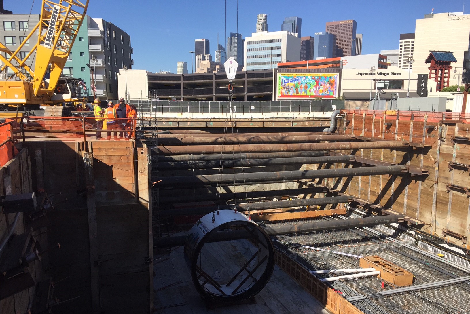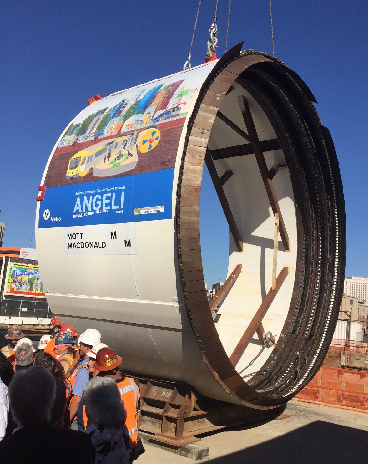Today’s ceremony featured the lowering of a shell that will encase the front of Angeli. The 21.5-foot diameter ring was lowered to the bottom of the massive construction pit at First Street and Central Avenue in Little Tokyo. The full TBM will be assembled and begin excavating in January. It will move at a rate of about 60 feet per day.