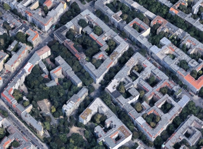But when we compare this to a solid looking European building block, we might be surprised to learn that buildings only line the edges against the streets, but that inside the block there is a green courtyard.