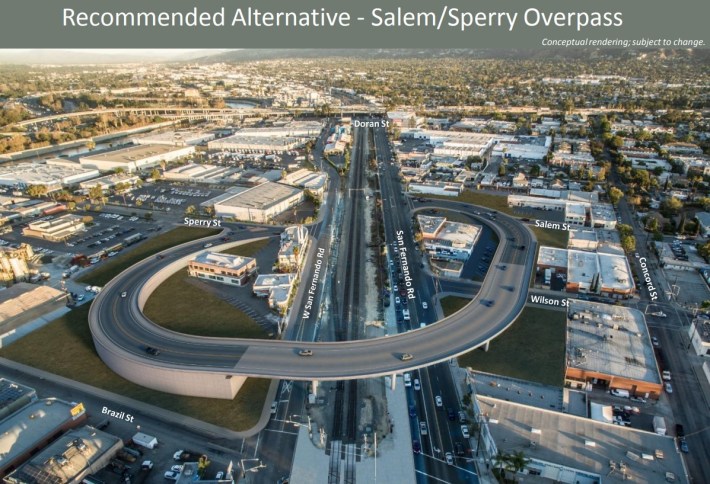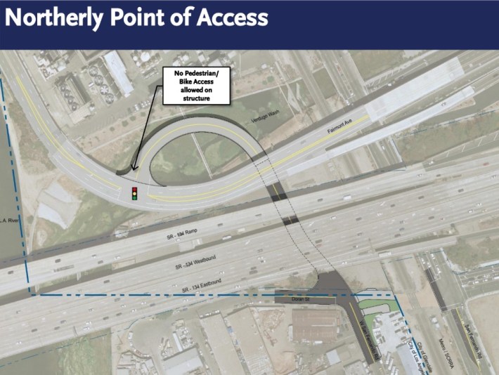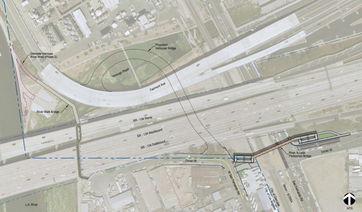 Metro had planned to include the Doran area bicycle/pedestrian access via Glendale’s Fairmont Avenue extension, essentially a sort of mini-freeway bridge designed to speed drivers to nearby studios. Per today’s Metro staff report, the Fairmont Bridge “does not allow for non-motorized traffic.” Metro is now proposing to instead add two new bike/ped bridges.