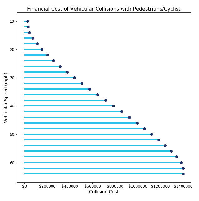 Beyond the obvious and catastrophic human toll of the roads in Los Angeles, there is also a disturbing financial toll. According to the USDOT, as of 2010, the cost of a fatal collision was about 1.4 million dollars. Roughly half of this cost is footed directly by cities, states, and individuals — as medical and funeral bills, lost labor productivity, and emergency response costs, for example. The other half is footed indirectly, through insurance costs. In both cases, road users — including tax-paying pedestrians and cyclists— are eventually covering the bill. In Los Angeles in 2018, that bill came to nearly $400 million.
