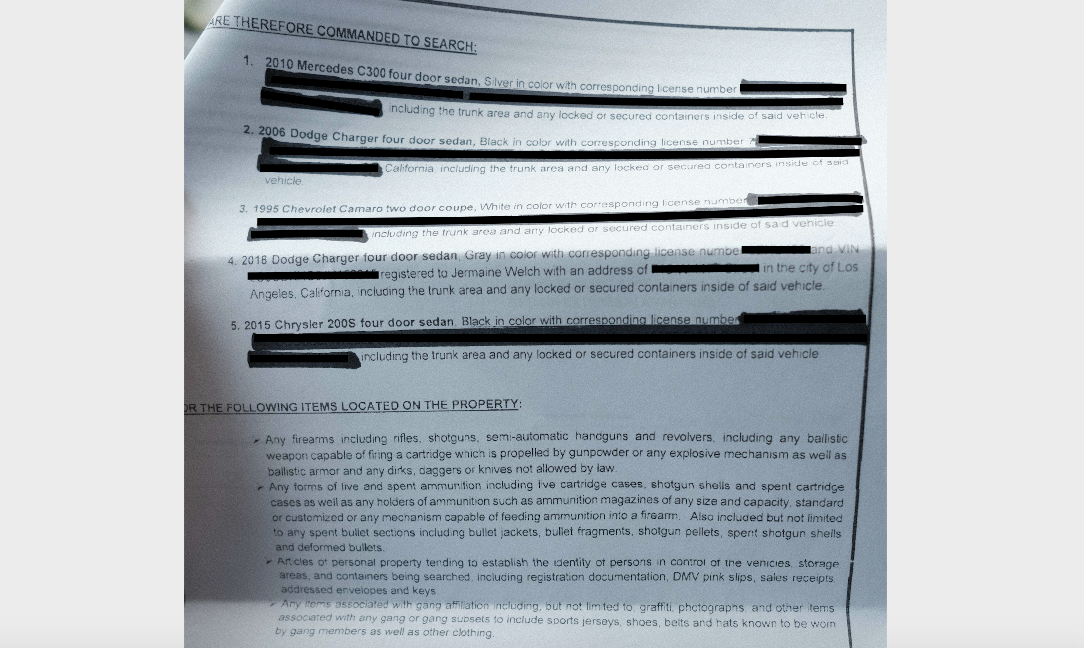 Clearly the first warrant – issued for his car on June 3 (below) – hadn’t netted the LAPD whatever it was that they were looking for. That warrant had allowed LAPD to seek and confiscate weapons, ammunition, and anything that might appear to offer evidence of gang affiliation from five different vehicles that had been at the scene that night. But nothing was found in Welch’s car except a spent bullet (to be expected, given that he was shot) and his phone (though Welch disputes this; he maintains his phone had been in his pocket).