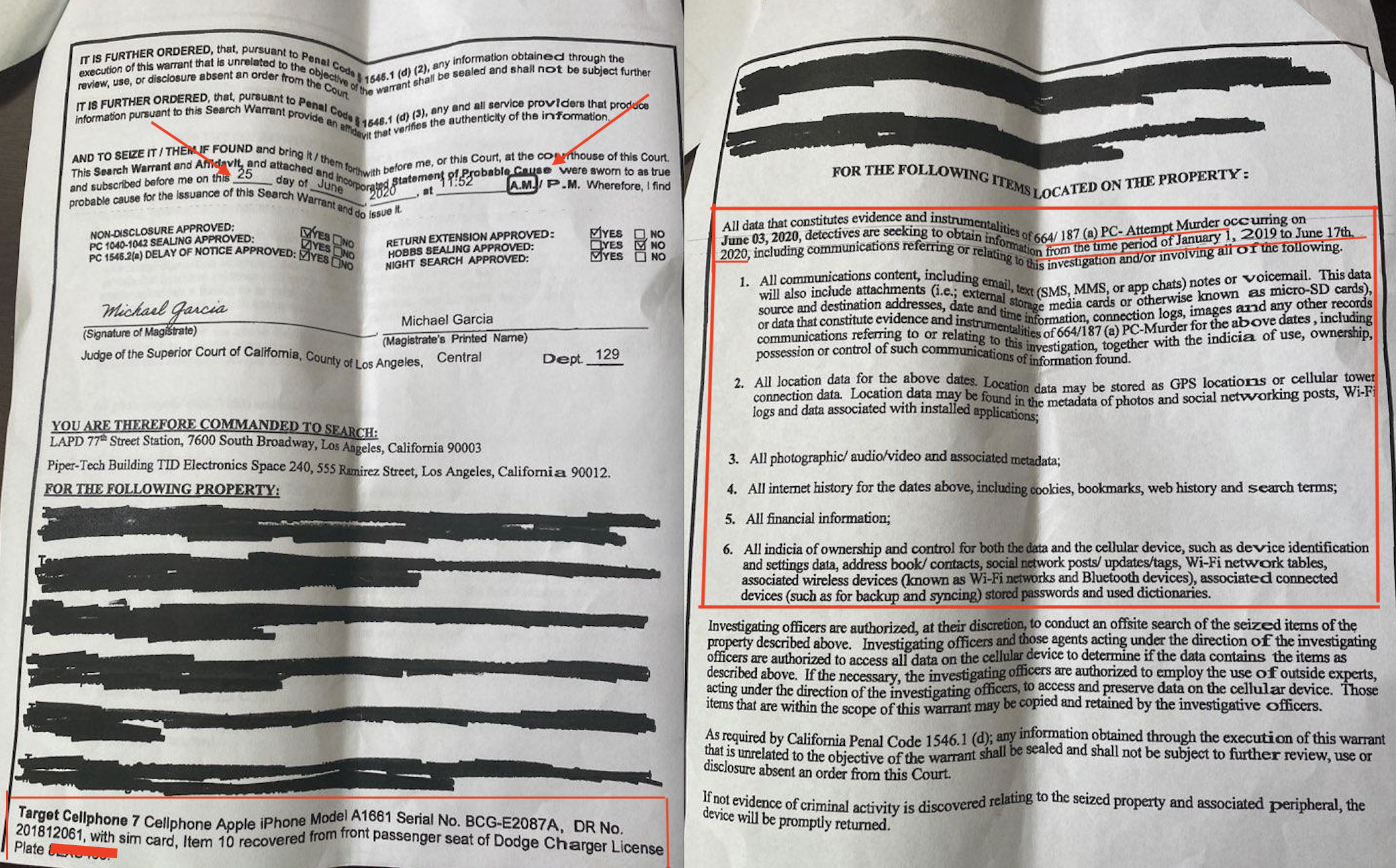 Then they made him wait outside at least another half an hour before emerging with a search warrant and affidavit granting LAPD license to search his cellphone (which they still had possession of).