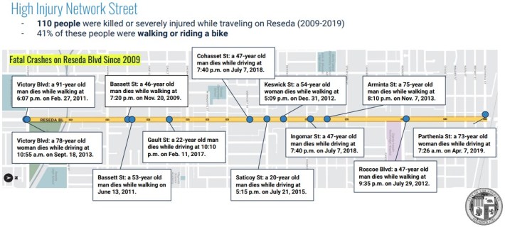 This stretch of Reseda has been prioritized due to a history of traffic deaths and serious injuries. According to the city’s project presentation, between 2009 and 2019 110 people were killed or seriously injured; nearly half of these were pedestrians and cyclists.