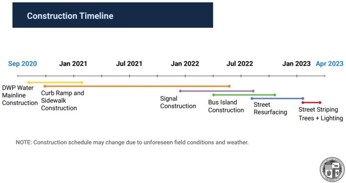 Reseda improvements construction is scheduled to get underway next week. Through the end of 2021, the only construction visible will be sidewalk work, including new curb ramps. In 2022, much of the remainder of the project gets underway, including new signals and bus islands. In early 2023, the street will be resurfaced and new trees and bus stop lighting will be added. Construction is anticipated to be complete in April 2023.