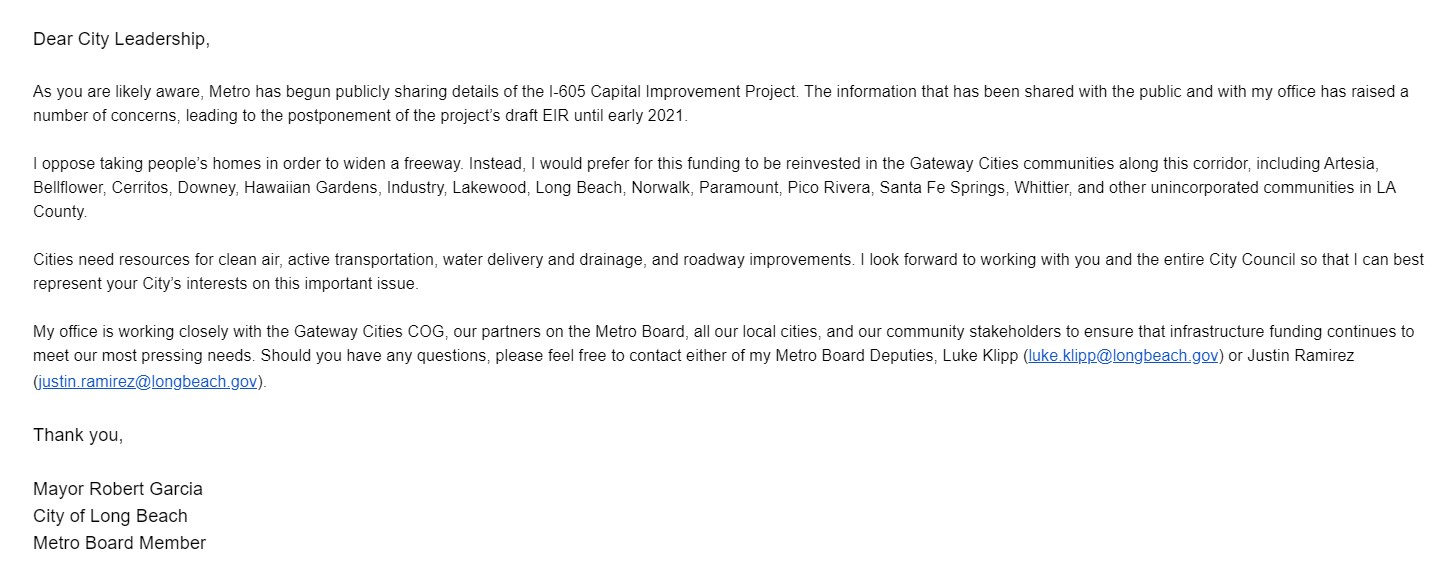 On September 29, Long Beach Mayor and Metro Boardmember Robert Garcia emailed Gateway Cities electeds stating, “I oppose taking people’s homes in order to widen a freeway” and instead proposed 605CIP project funding “be reinvested in the Gateway Cities communities along this corridor… for clean air, active transportation, water delivery and drainage, and roadway improvements.”