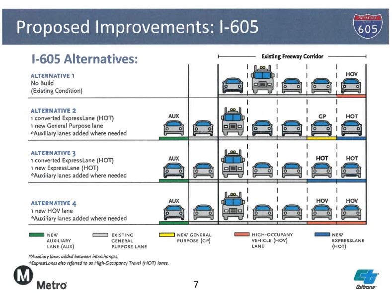 The motion directs Metro CEO Phil Washington to craft a final report with other alternatives, including one that minimizes right-of-way impacts and/or a Transportation System/Demand Management (TSM/TDM) alternative. Note that in 2016, during the 605CIP scoping process, Metro had announced that its environmental studies would include both of those alternatives. But sometime between 2016 and 2020, Metro ditched those previously announced alternatives in favor of three very similar alternatives, all of which would add four lanes to the 605 Freeway.
