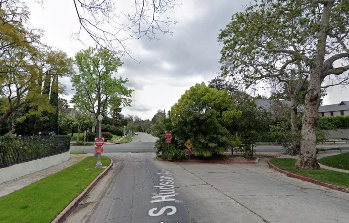 In Hancock Park, this Hudson Avenue island prevents drivers from turning south off of 6th Street. This example improves safety by minimizing turns along a lower-visibility curve.